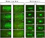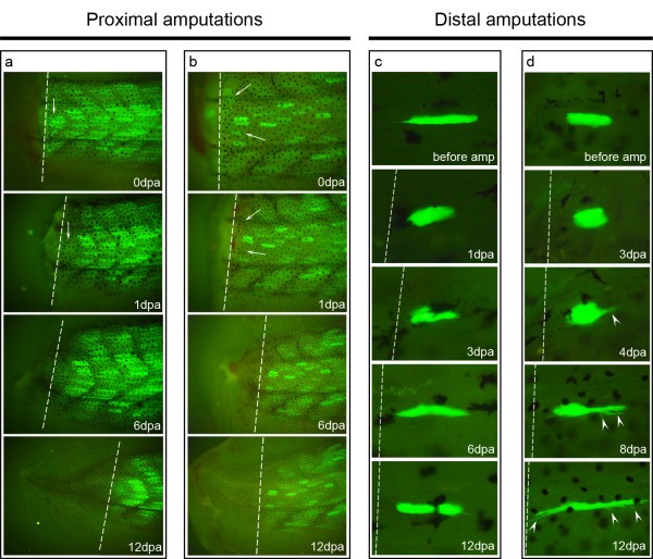Figure 5. In vivo observations show that tadpole tail myofibres do not fragment. (a, b) Tail regeneration results of Car-nCre_Hsp-nlcCre_CALNL-GFP F1 transgenic tadpoles amputated approximately in the middle of the tail ("proximal amputations"). Many of the labelled myofibres next to the amputation plane were not found at 1 dpa probably because they degenerated. From 1 dpa till the end of the observations, the number and position of labelled myofibres did not change, indicating that there was no myofibre fragmentation. Also, no labelling was observed in the regenerate. n = 18 animals. (c, d) In vivo tracing of single myofibres in the distal part of the tail of Car-ERCreER/CALNL-GFP or Car-nCre_Hsp-nlcCre_CALNL-GFP transgenics. Myofibres close to the amputation plane generally showed a compact or retracted shape at 1 dpa (n = 94 fibres). During the next days, these muscle fibres started to recover the elongated shape, sometimes forming long citoplasmic projections (arrowheads). At 12 dpa, the shape of the myofibres was again elongated but generally different from the initial shape. Dashed lines: amputation planes.