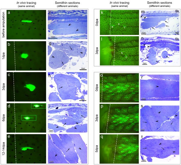 Figure 7. Relation between myofibre retraction and dedifferentiation phenotype. (a-j) During regeneration, "short" myofibres change their shape from elongated (before amputation) to compact (1-4 dpa) and back to elongated (6-12 dpa) (a-e, e corresponds to 12 dpa; n = 94 fibres). This change in shape is also observed in semithin sections of wild-type animals fixed at different days post amputation (f-j, j corresponds to 14 dpa; n ⥠six sections per animal, three animals per time point). At 1 dpa (b, g), "short" myofibres are retracted (b) and the dedifferentiation phenotype is occasionally observed in fibres with similar compact shapes (g, arrows point to disorganized sarcomeres, arrowheads point to normal sarcomeres. See also Figure 3c-e). At 3 dpa (c, h), the dedifferentiation phenotype is more common and is generally present in myofibres with irregular shapes (h, arrow), i.e., the ones that retracted (c). At 6 dpa (d, i), retracted myofibres start to have a more elongated shape (d, boxes correspond to different focal planes) and the dedifferentiation phenotype is now less common (i, arrows), with more myofibres showing normal sarcomeres (i, arrowheads). At 12-14 dpa (e, j), elongated shape is regained (e) and many myofibres show a normal internal structure (j, arrowheads), while few still have some sarcomeric disorganization (j, arrow). (k-n) The "long and thin" myofibres were less prone to retract (compare fibre "b" in k and l; n = 21 fibres), in contrast to "short" myofibres that become even shorter with amputation (compare fibre "c" in k and l). Comparatively, "long and thin" myofibres did not show the dedifferentiation phenotype at 3 dpa (arrowheads in m and n), while short myofibres did (arrows in m and n). Myofibre "a" died with the amputation (was not found at 1 dpa). Nt: notochord. Sk: skin. (o-t) Proximal amputations (done approximately at the middle of the tail) generally resulted in no or little myofibre retraction (o-q; n = 18 animals). Likewise, semithin sections (r-t) revealed that myofibres generally kept the organized internal structure (arrowheads), with some myofibres showing only a mild disorganization of the sarcomeric structure (arrows). Dashed lines: amputation planes.