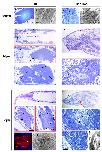Figure 3. Tadpole tail myofibres show a dedifferentiation phenotype. (a, b) Control tail myofibres, showing the orderly aligned sarcomeric structure in semithin sections (a) and TEM micrographs (b). (c-e) At 1 dpa, dead myofibres are frequently observed next to the amputation plane in the tail (asterisk). Many myofibres show a more compact shape with an apparently normal sarcomeric structure (arrows) while others show some sarcomeric disorganization (arrowhead in d). In few cases, the sarcomeric disorganization is more severe (arrowhead in e). (f-h) At 3 dpa, a considerable regenerate has formed (f) and more stump myofibres show the dedifferentiation phenotype (g, h). (g) Myofibre close to amputation plane with an irregular shape and big regions in the sarcoplasm devoid of sarcomeres (arrowhead). (h) Another myofibre, farther from the amputation plane, showing the same phenotype (arrowheads). Externally to this myofibre there is a longer fibre. These longer muscle fibres never show an obvious dedifferentiation phenotype. (i) Confocal image of a tail myofibre with disarranged alpha-sarcomeric actin (ASA, arrowhead) at 3 dpa. (j) TEM micrograph of a myofibre with dissociating myofibrils (arrowheads) next to a region with organized myofibrils (arrow), at 3 dpa. (k, l) Muscle in the zeugopod of stage 54 hindlimbs is very immature. It is mainly composed of myoblasts and young myofibres (arrows). (m, n) At 1 dpa, no obvious changes are observed (arrows: young myofibres). (o-r) At 3 dpa, distal myofibres are still very similar to the ones observed at 0 and 1 dpa (arrows: young myofibres). No obvious dedifferentiation was observed in the limb muscle. Dashed lines: amputation planes. n ⥠six sections per animal, three animals per time point.