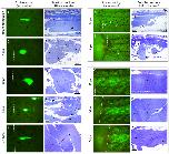 Figure 2. Inducible Cre constructs do not label limb muscle. (a) Representation of the Car-ERCreER/CALNL-GFP construct, where Car promoter is driving the expression of the tamoxifen-inducible Cre recombinase. On the same vector but in opposite direction, we placed a reporter construct composed of the constitutive CAG promoter driving the expression of a floxed neo gene. Downstream of it, there is the eGFP gene that is only expressed when Cre is able to remove the floxed neo gene. (b, c) After two weeks of daily intraperitoneal tamoxifen injections, only few myofibres were generally labelled in the tails (b) and less than 1% of transgenics had any label in the hindlimb (c) of Car-ERCreER/CALNL-GFP F1 and F2 transgenics (arrows: faint GFP+ myofibres). n > 100 animals. (d) Representation of the Car-nCre, Hsp-nlcCre and CALNL-GFP constructs. Here, the Cre recombinase is split in two inactive fragments (nCre and nlcCre). In this system, Cre is only active when both fragments are co-expressed. To make the system inducible and muscle-specific, we cloned the nCre fragment under the Car promoter and the nlcCre fragment under a heat-shock-inducible promoter (Hsp70). (e-g) After heat-shock treatments of F1 tadpoles, we generally observed strong expression of GFP in the trunk (arrow) but no expression in the hindlimbs (compare e with e'. Arrowheads point to the unlabelled hindlimb). We also observed that the number of labelled myofibres was lower in the middle of the tail (g) and even lower closer to the tip of the tail (f). n > 100 animals.