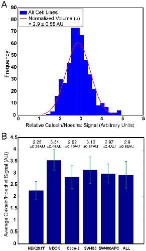 Figure 2. Population statistics of all cell types.Population statistics of all cells showing the (A) histograms of normalised volume (Calcein AM/Hoechst) and the (B) average normalised volume column chart. (AU: Arbitrary Units).