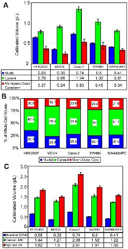 Figure 4. Cell volume measurement statistics for non-dividing cells.Fluorescent marked and calculated compartment volumes and distribution results showing (A) calibrated cell compartment volumes in pL, (B) distribution of compartment volume (% of total) and (C) fluorescent marked volumes in pL for non-dividing cells.