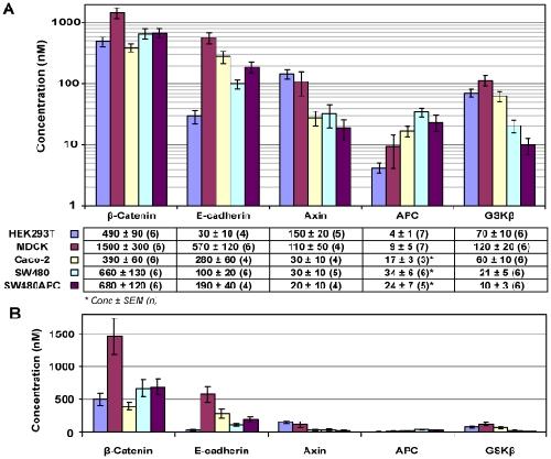 Figure 6. Key protein concentration distribution in mammalian cells.(A) Average concentration of key Wnt proteins and E-cadherin of the five mammalian cell lines. (B) Figure redrawn in linear scale, reiterating the significant difference in concentrations between the proteins measured and the effect of log scales on perception of concentration differences. *Note that the APC measured in Caco-2, SW480 and SW480 are ΔAPC. The amount of wild type APC is too low to be detected and the measurement here is for ΔAPC. In SW480APC, approximately 95% of the total APC is ΔAPC (unpublished data) (Data: Concentration in nM ± SEM (n repeats), Error bars: SEM).