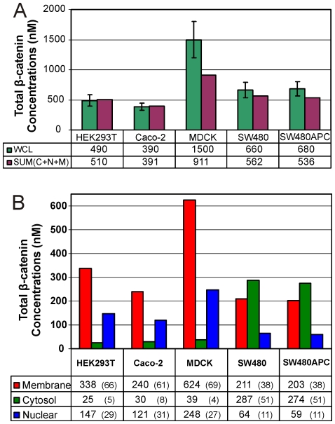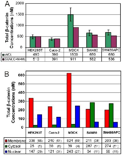Figure 7. Sub-cellular distribution of β-catenin in mammalian cells.(A) Compartment concentrations for β-catenin in HEK293T, Caco-2, MDCK, SW480 and SW480APC cells. Note: Percentage of whole cell β-catenin concentrations is in parentheses. (B) Protein recoveries (Sum of compartment proteins) from the fractionation experiment compared with the measured whole cell lysate.