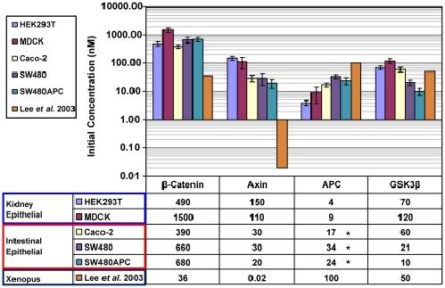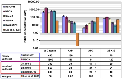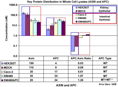 Figure 8. Concentrations of Axin and APC in mammalian whole cell lysate.The data is displayed in log scale. * Note that for SW480APC, as the level of wild-type (WT) APC is too low to be detected in this set of experiments, the measurements made in this study comprised that of mutant (MT) APC only. Error Bars: SEM.