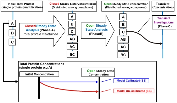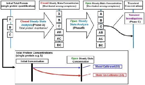 Figure 10. Computational Modelling Steps and Model Calibration Test Requirement.Typical computational modelling involves initial steady state analysis: Phase A, initial concentration to steady state protein redistribution in a closed system (no input and output from the system); Phase B, steady state protein redistribution in an open system and a subsequent transient analysis (Phase C, steady state to perturbation time-course). Phase A and B involves redistribution of proteins among the protein complexes while Phase C applies the redistributed concentrations to conduct transient investigations. Phase A and B are initial pre-requisites for a calibrated model whereby the total protein concentration for each protein should be maintained at steady state in an open system (inset).
