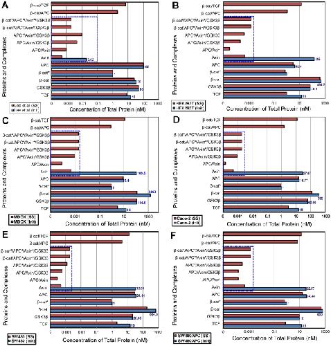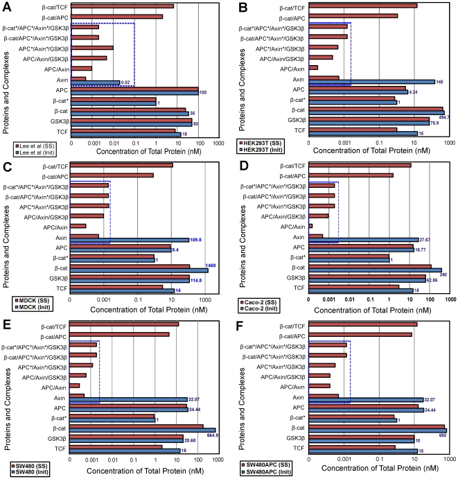 Figure 11. Steady State Analysis of protein complex for different cell lines.Initial to steady state protein redistribution among the interacting complexes of the Wnt signalling pathway for the different cell lines. (A) Xenopus (B) HEK293T (C) MDCK (D) Caco-2 (E) SW480 and (F) SW480APC. Note: Concentrations of protein and complexes involving Axin (in dotted box) are significantly low in all cell lines.