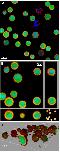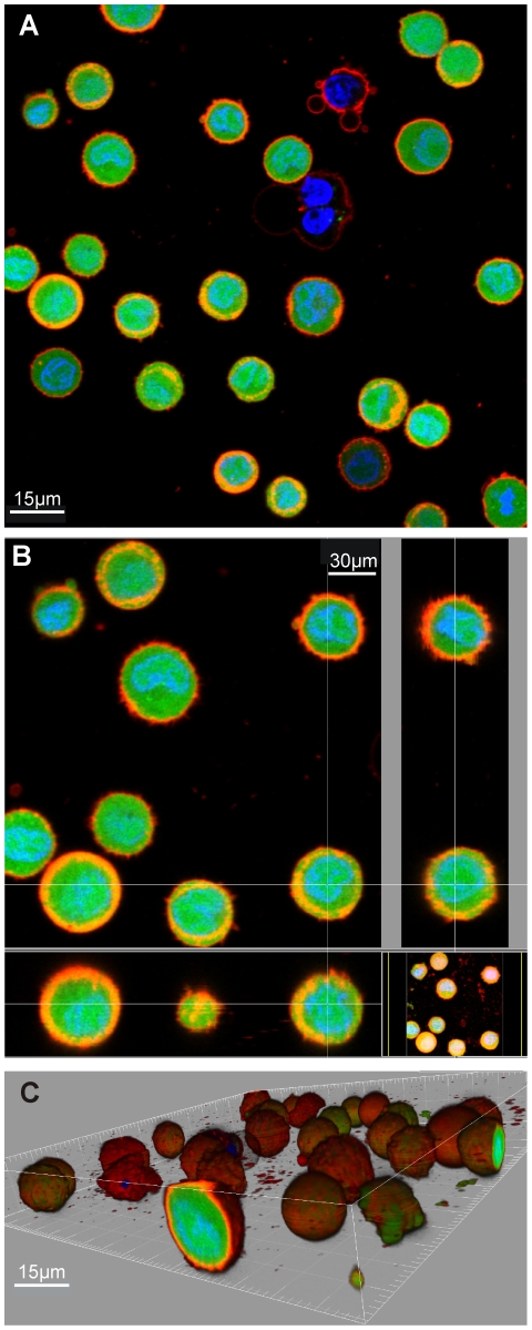 Figure 1. 3D confocal imaging sample results (SW480APC).Trypsinised SW480APC cells stained with Calcein AM fluorescent dye (green), Hoechst 33342 nucleic acid stain (blue) and Vybrant DiI cell labelling solution (red), fluorescent marking the cytoplasm, nuclei and membrane respectively. Different overlayed fluorescent signal views of a sample of the acquired image stack are as show, namely (A) 2D sectional view; (B) orthogonal views of selected cells; (C) 3D volumetric view with blending effect.