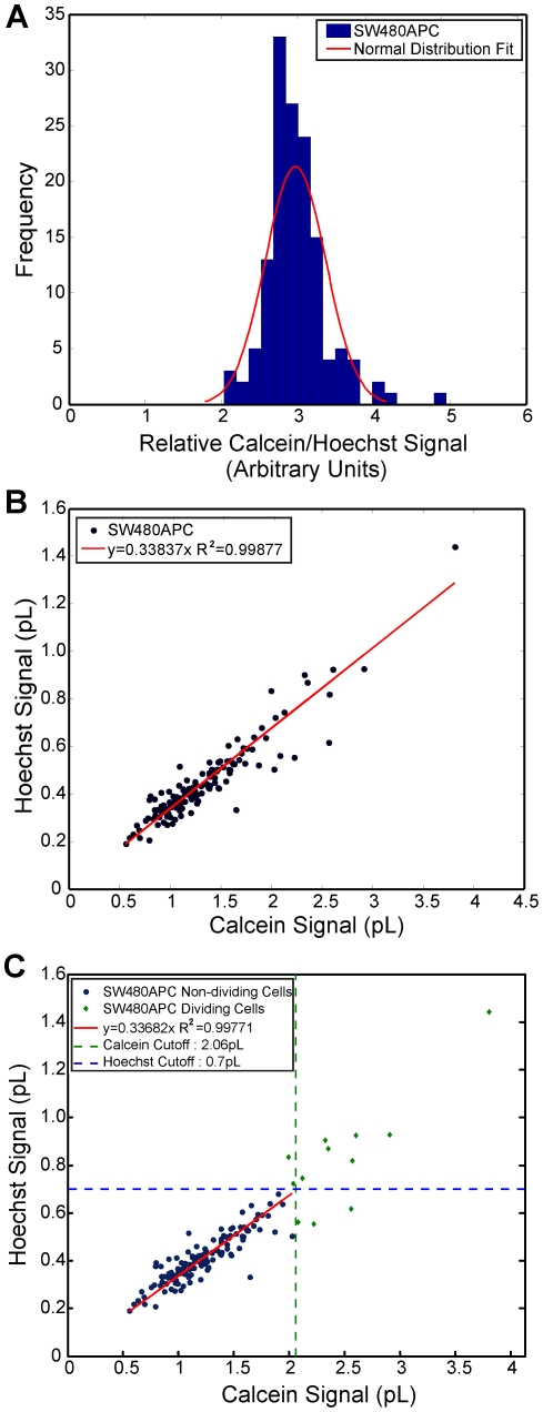 Figure 3. Cell population sizing and selection.Population statistics of SW480APC, showing the (A) histograms of normalised volume (Calcein AM/Hoechst); (B) Scatter plot of fluorescent marked volumes (Calcein AM vs. Hoechst) showing a good linear relationship; (C) Scatter plot of fluorescent marked volumes (Calcein AM vs. Hoechst) showing population isolation and the cut-off volumes applied. Statistical results for other cell lines are as shown in the Figures S12, S13, S14, and S15.