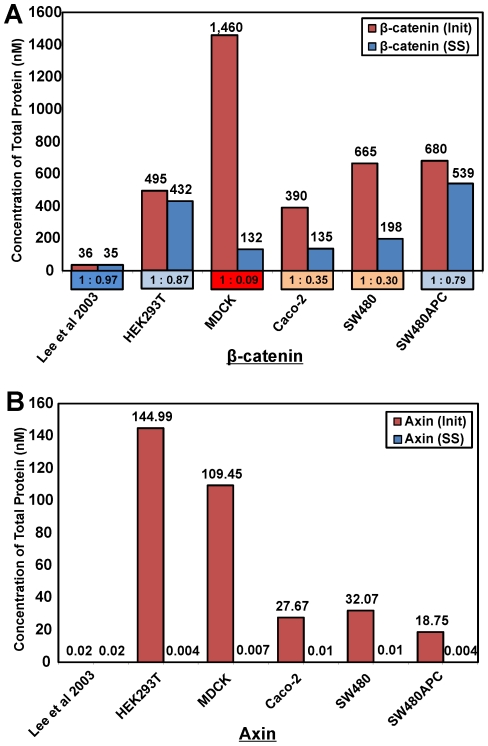 Figure 12. Total protein concentrations of β-catenin and Axin.Initial and Steady State total concentrations for Xenopus egg extract (Lee et al., 2003) and whole cell lysate (WCL) from the mammalian cell lines. As expected, APC and GSK3β remained stable (results not shown) due to the lack of input and output fluxes in the Lee et al., 2003 model. Notes: For β-catenin, the ratio of total initial to steady state (Iâ¶SS) concentrations are given in the box below the bar for the respective cell line. Total protein concentration implies summation of concentrations of free and all protein complexes containing the specific protein.