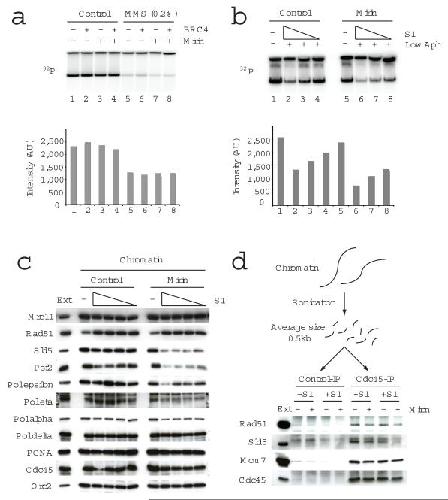 Figure 4. MRE11 nuclease activity is required for DNA replication upon fork collapse. In (a) and (b) the effects of MRE11 nuclease inhibitor mirin on replication of sperm nuclei that were untreated or treated with MMS in the presence or absence of GST-BRC4 (a) or on sperm nuclei incubated in extracts treated with 0, 0.73, 0.37, 0.18 U μl−1 S1 nuclease and aphidicolin were monitored (b). Replication products were monitored by 32P-dATP incorporation and resolved by neutral agarose gels, which were subjected to autoradiography. Signal intensities were reported in the graphs. In (c) the effect of mirin on replication proteins bound to chromatin isolated after 50 min incubation in extracts treated with 0, 1.46, 0.73, 0.37 and 0.18 U μl−1 S1 nuclease was analysed. In (d) the binding of the indicated fork proteins to chromatin incubated for 45 min in egg extracts that were untreated or supplemented with 0.73 U μl−1 S1 nuclease and mirin was monitored following protein crosslinking, sonication induced DNA fragmentation and immunoprecipitation with control and anti-CDC45 serum. * non-specific band. Ext: 0.5 μl egg extract was loaded as a control in (c) and (d).