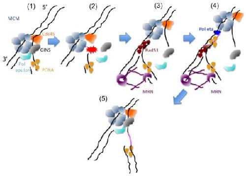 Figure 6. A model of replication fork collapse and restart: The presence of a ssDNA lesion in the template creates one-sided DSB at the passage of the replisome (1) leading to the dissociation of the GINS and Pol epsilon from the fork, whereas MCM and CDC45 remain stably bound to collapsed forks (2). The one-sided DSB undergoes MRE11 mediated nuclease resection and RAD51 dependent strand annealing/invasion of the intact template. The MRE11 complex might also tether the broken DNA strand to the intact one (3). This process requires BIR proficient PCNA, which promotes Pol eta dependent strand extension (4). Reloading of the GINS and Pol epsilon in an origin independent fashion promotes reassembly of functional replisome (5).