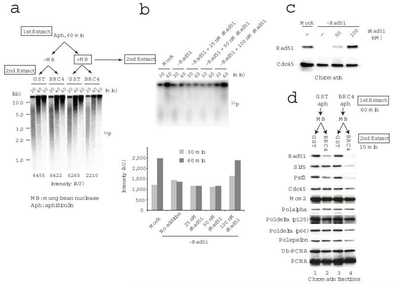 Figure 3. RAD51 is required for origin independent fork restart and reloading of replisome components after fork collapse. In (a) and (b) replication fork restart was monitored following incubation of sperm nuclei in the 1st extract for 60 min with or without 10 μg/ml aphidicolin and then transferring nuclear fractions that were untreated or briefly incubated with Mung bean nuclease to a 2nd extract containing 320 nM geminin, 1 mM roscovitine and GST or GST-BRC4 (a), or to mock or RAD51-depleted extracts containing 25, 50, 100 nM recombinant RAD51 (b). Replication products were monitored by incorporation of 32P-dATP added to the 2nd extract and resolved by alkaline (a) or neutral agarose gel (b) and subjected to autoradiography. Quantification of signals is shown at the bottom of the gel in (a) and in the graph (b). In (c) chromatin binding of RAD51 and CDC45 was monitored in egg extracts that were mock or RAD51 depleted and supplemented with the indicated amount of recombinant RAD51 (rRAD51). The status of replication fork proteins bound to chromatin isolated from extracts treated as in (a) is shown in (d).