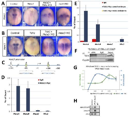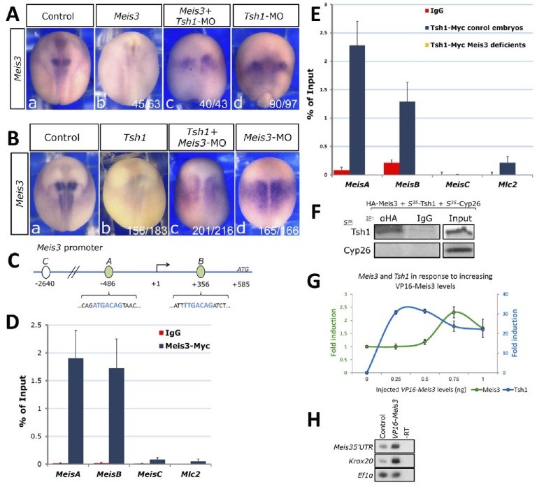 analysis in mid-neurula embryos injected at the one-cell stage with Meis3 mRNA (1 ng; b) or Tsh1-MO (5 pmol; a), or both (c). (B)Meis3 expression in mid-neurula embryos injected at the one-cell stage with Tsh1 mRNA (0.4 ng; b) or Meis3-MO (28 ng; d), or both (c). (C)A schematic representation of the Meis3 proximal promoter region. Arrow indicates start of transcription; green ovals indicate two Meis consensus sites (A and B), indicated in light-blue text; white oval indicates ChIP-negative control site (C); numbers indicate positions relative to the transcription start site (+1); ATG (+585) is the translation initiation site. (D)ChIP-QPCR analysis on the Meis3 promoter in Meis3-Myc injected embryos (0.8 ng) at mid-neurula stages. MeisA and MeisB are Meis consensus site amplicons, MeisC and Mlc2 are negative control sites. IgG ChIP is a negative IP control. Pooled data from three independent experiments are represented as the percentage of input chromatin. Error bars are s.e.m. from three independent experiments. For amplicon primers, see supplementary material Table S2. (E)ChIP-QPCR analysis on the Meis3 promoter in Myc-Tsh1- injected embryos (0.4 ng), either wild type or Meis3-MO (28 ng) co-injected, at mid-neurula stages. IgG-IP, MeisC and Mlc2 are negative controls as in D. Pooled data from three independent experiments are represented as the percentage of input chromatin. Error bars are s.e.m. from three independent experiments. Tsh1-ChIP on Meis3-MO embryos (yellow) completely abolished the Tsh1-ChIP signal seen in wild-type embryos (dark blue). Tsh1 ChIP to both wild-type and Meis3-MO embryos were performed together in the same experiment and ChIP run; thus, Tsh1 ChIP on wild-type embryos is a positive control for Tsh1 ChIP on Meis3-MO embryos. (F)In vitro co-IP of Tsh1 and Meis3 proteins. In vitro synthesized HA- Meis3, S35-Met-Tsh1 and S35-Met-Cyp26 were mixed. HA-Meis3 IP was performed. IgG-IP and Cyp26 are a negative controls. (G)Kinetics of Tsh1 and Meis3 transcription in response to increasing levels of a forced Meis3 transcriptional activator. RT-PCR was performed on pools of 18 mid- neurula AC explants from VP16-Meis3 mRNA-injected embryos (0.25-1 ng). Results were quantitated, normalized to the Ef1-alpha control and plotted as fold change. Bars are s.e.m. from three independent experiments. T samples showed no DNA contamination. A x-value is the non-injected controls, with a y-value as a basal expression level. (H)RT-PCR to Meis3-5'UTR and Krox20 in mid-neurula embryos injected with VP16-Meis3 mRNA (250 pg). Robust Krox20 expression controls for a strong Meis3 protein activity.