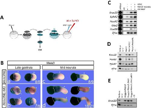 Fig. S4. Meis3 protein positively auto-regulates initial Meis3 gene expression. A Meis3 expression analysis in late gastrula embryos injected with the Meis3 MO (25 ng). Meis3 expression is inhibited in Meis3 deficient embryos.
