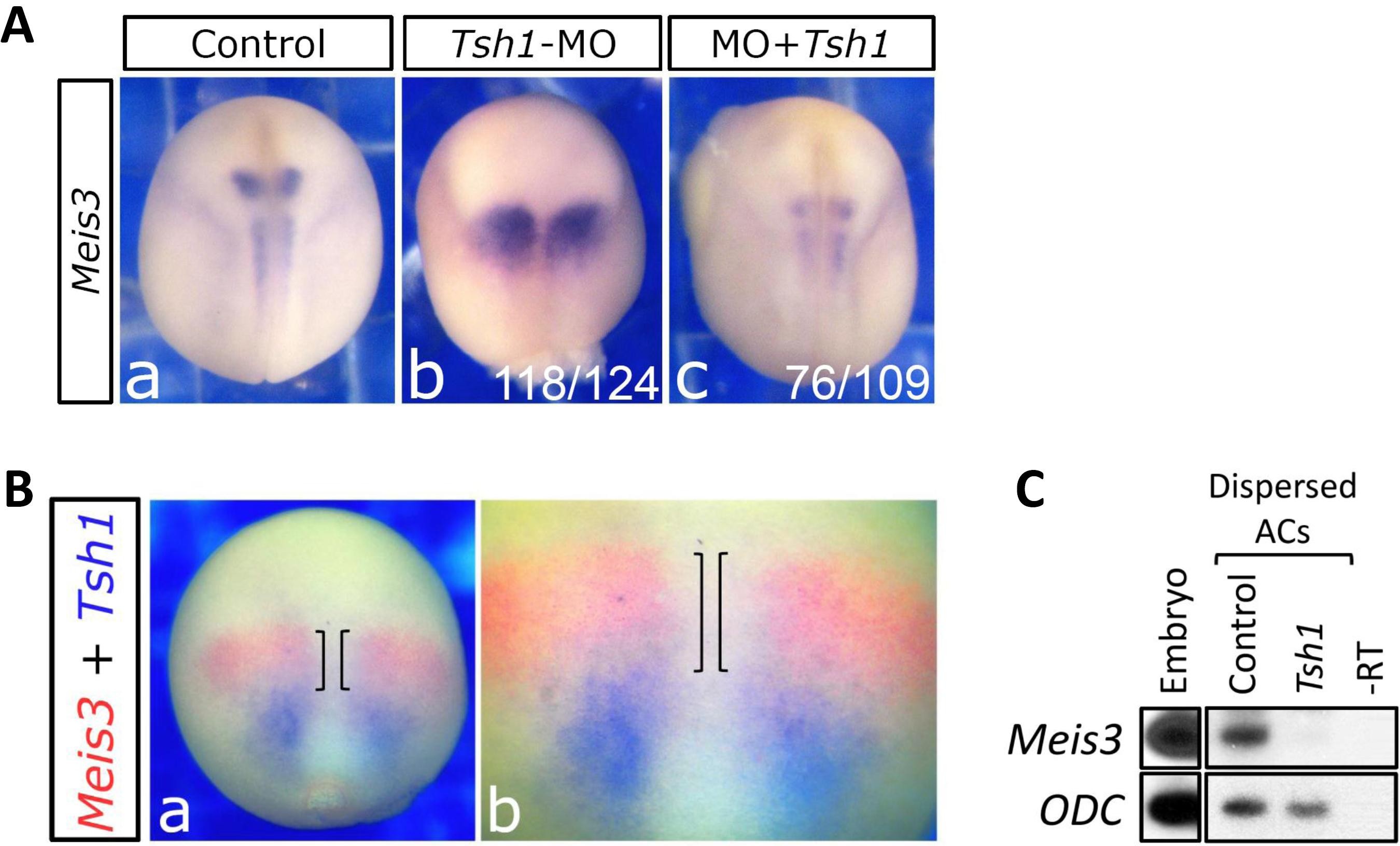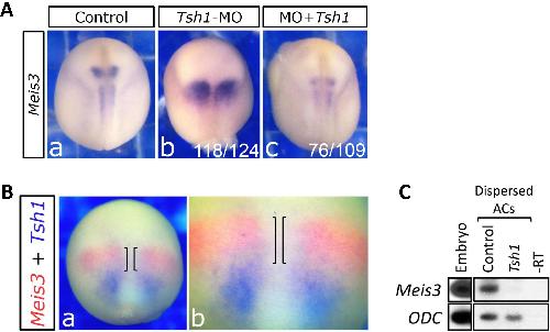 Fig. S3. Knockdown of Meis3 and Tsh1 synergizes Meis3 gene expression. (A) Meis3 expression analysis in mid-neurula embryos injected with either the Meis3 MO (23 ng), Tsh1 MO (3 pmol), or both. Although the enhanced expression of Meis3 sustains a relative normal late pattern in either type of knockdown embryo, both deficiencies induce the robustly expanded early expression pattern of Meis3. (B) Overlapping expression of Meis3 and Tsh1 in the hindbrain. Double in situ hybridization to Meis3 (red) and Tsh1 (purple) in mid-neurula embryos. (a) Whole embryo. (b) Higher magnification, bars indicate the overlapping hindbrain expression. (C) Tsh1 represses Meis3 expression cell-autonomously. RT-PCR to Meis3 in mid-neurula stage dispersed AC explants from embryos injected with Tsh1 mRNA (500 pg).