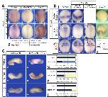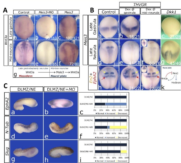 Fig. 1. A neural Wnt3a-Meis3 loop restricts hindbrain development. (A)Wnt3a expression in late-gastrula (a-c) or mid-neurula (d-f) embryos injected at the one- cell stage with either Meis3-MO (25 ng) or Meis3 mRNA (0.5 ng). In all figures, the phenotype frequency is indicated in each panel. (g)ï A schematic summary of the results. (B)ï Meis3 expression in late-gastrula (a-c) or mid-neurula (d-g) stage embryos injected at the one-cell stage with either THVGR (50 pg) or Dkk1 (35 pg) mRNAs. THVGR was activated by 1ï ïM dexamethasone (Dex) at gastrula (b,e,i) or mid-neurula (f,j) stages. Unactivated THVGR controls develop normally (insets in f, j). (k)A schematic summary of the results. See supplementary material Fig. S1. (C)EphA2 (a,b), n-Tub (d,c) and Slug (g,h) expression in mid-neurula stage DLMZ/NE recombinant explants (see text). For each recombinant: DLMZ is the pigmented-brownish tissue on the left/top (except in b, where it is on the back of the explant); NE is the albino tissue on the right/bottom. NEs are from embryos injected with BMP dominant-negative receptor (DNR) mRNA (160pg) and/or Wnt3a- MO (40ng). (c,f,i) The expression phenotype for pooled explants; for each group, 14-16 explants were examined per marker.