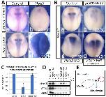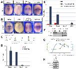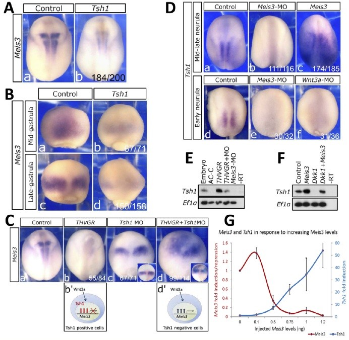Fig. 3. Tsh1 is a Meis3 gene repressor that modulates Wnt/Beta-catenin activity and is regulated by Meis3 protein. (A,B)Meis3 expression in (Aa,b) mid-neurula and (Ba-d) gastrula embryos injected at the one-cell stage with Tsh1 mRNA (0.5 ng). (C)Meis3 expression in mid-neurula embryos injected at the one-cell stage with THVGR mRNA (40 pg; b) or Tsh1-MO (5 pmol; c), or both (d). Insets in c, d show Meis3 expression in late gastrula wild-type or THVGR- injected embryos, respectively. b' and d' schematically show Tsh1 modulation of the Wnt/Beta-catenin transcriptional response of Meis3. (D)Tsh1 expression in mid or early-neurula embryos injected at the one-cell stage with Meis3- MO (30 ng; b,e) or Meis3 mRNA (1 ng; c), or the Wnt3a-MO (45 ng; f). (E)RT-PCR to Tsh1 in mid- neurula stage AC explants from embryos injected with THVGR mRNA (40 pg) or Meis3-MO (30ng), or both. (F)RT-PCR to Tsh1 in mid-neurula embryos injected with Meis3 mRNA (0.8 ng) or Dkk1 mRNA (35 pg), or both. (G)Transcriptional kinetics of Tsh1 and Meis3 genes in response to increasing levels of Meis3 protein. RT-PCR was performed on pools of 18 mid-neurula AC explants from embryos injected with Meis3 mRNA (0.1-1.2ng). Results were quantitated and normalized to the Ef1-alpha control, and plotted as fold change. Bars are s.e.m. from three independent experiments. T samples showed no DNA contamination. A x-value is a non- injected control, with a y-value as a basal expression level.