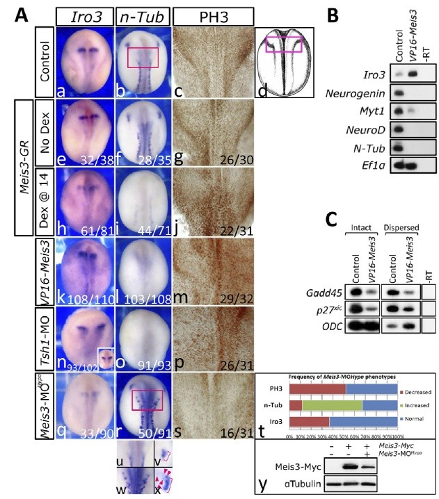 Fig. 5. Meis3 induces proliferative Iro3+ neural progenitors and inhibits their terminal differentiation. (A)ï Embryos were injected at the one-cell stage with Meis3-GR (250 pg; e-j), or VP16-Meis3 (250 pg; k-m) mRNAs, or Tsh1-MO (4 pmol; n-p) or Meis3-MOHypo (5 ng; q-s). Meis3-GR embryos were activated by 1ï ïM Dex at neurula stage 14, or kept untreated as controls. Iro3 and n-Tub expression was examined at neurula stages. The inset (n) shows Iro3 expression in early-stage wild-type embryos. u and w are magnifications of the hindbrain region (pink rectangle) of b and r, respectively. v and x show the trigeminal neuron of wild-type and Meis3- MOHypo embryos. Brackets and arrowheads indicate trigeminal expansion and ectopic differentiated foci, respectively. Cell proliferation was also assayed. Stacked images of 25 focal planes of cleared PH3-immunostained whole neural tubes are shown. Images are enlargements of the hindbrain region (pink rectangle in d). (t)ï Meis3- MOHypo phenotype frequency is shown. (y)ï Embryos were injected with Meis3-Myc (50 pg) and/or Meis3-MOHypo and western analysis at mid-neurula stages shows a moderate decrease in Meis3-Myc protein levels. (B)ï Transcriptional profiling of VP16-Meis3 neurons. RT-PCR to neural-specific developmental markers in mid-neurula embryos injected at the one-cell stage with VP16-Meis3 (250 pg) mRNA. (C)ï Meis3 represses p27Xic1 and Gadd45ï§ expression cell- autonomously. RT-PCR to p27Xic1 and Gadd45ï§ in mid- neurula stage intact or dispersed AC explants from embryos injected with VP16-Meis3 mRNA (0.8 ng)