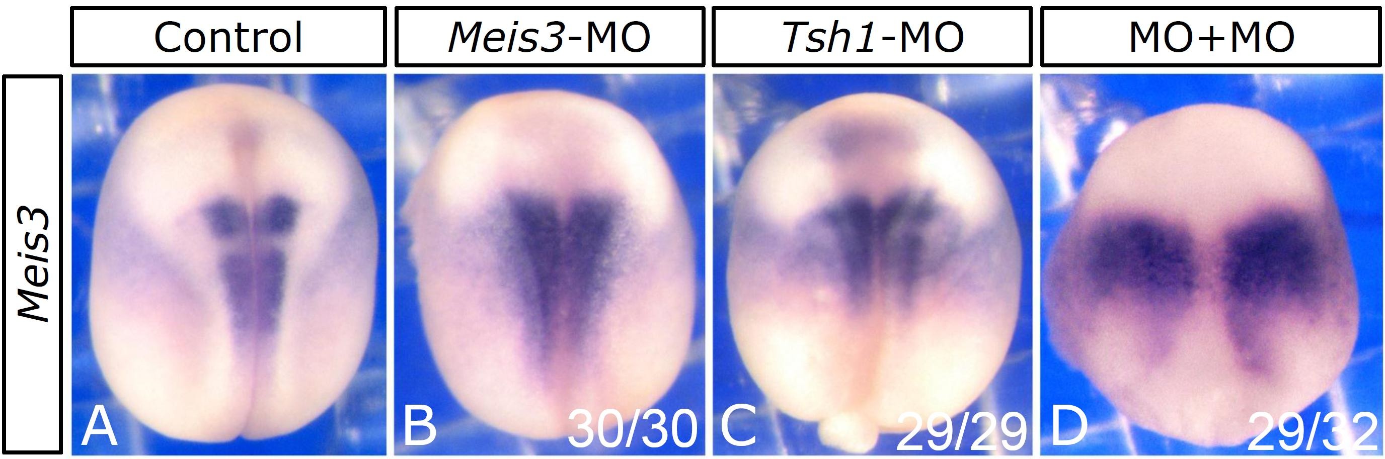 Fig. S2. The Tsh1 MO is a specific Tsh1 inhibiting tool in the context of Meis3 repression. A Meis3 expression analysis in mid-neurula embryos injected with Tsh1 MO (4 pmol) and/or Tsh1 mRNA (0.8 ng). In Meis3-expanded Tsh1-deficient embryos, Tsh1 mRNA suffices for rescuing the normal wild-type pattern of Meis3 expression.