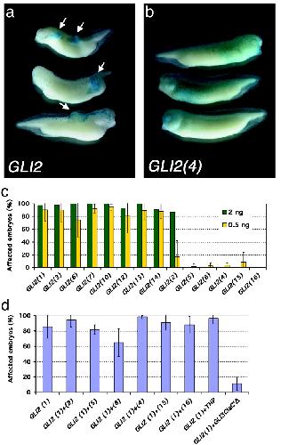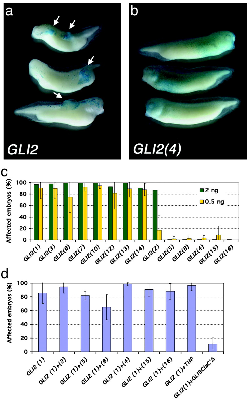 Fig. 3. Targeting GLI2 to the ectoderm leads to the development of skin tumors. (a) Either 2 or 0.5 ng of GLI2 synthetic mRNA was injected along with tracer amounts of lacZ mRNA to mark injected cells. (b) An example of a loss-of-function allele (construct 4) where 5-bromo-4-chloro-3-indolyl β-d-galactoside-stained cells do not form tumors and show a pattern indistinguishable from that of lacZ mRNA-only injections (data not shown). (c) Histograms showing the percentage of affected embryos with overgrowths after misexpression of the different GLI2 alleles. Experiments were performed at two different concentrations, 0.5 ng (yellow) and 2.0 ng (green) per embryo. The 2-ng concentration was done once, and the 0.5-ng concentration was repeated three or four times per sample. The mean ± SEM is represented in the histogram. Each sample in each experiment had 20-70 embryos. All of the missense variants behaved similarly to WT, suggesting that they do not affect GLI2 function. On the other hand, allele 2 showed a less penetrant phenotype at low concentrations, indicating that it could be a hypomorph. This lower induction was significantly different from that of allele 6 (P < 0.05). Allele 8, which represents the more likely form, and allele 15 showed traces of activity, but the mean values were not significantly different from that of allele 4 (P > 0.5 for both), which had no activity. These alleles (nos. 8, 4, 15) plus alleles 5 and 16 are scored as loss-of-function in this assay. (d) Coinjection of WT GLI2 mRNA with each of the mutant constructs (in amounts of 0.5 ng of each) was assessed for synergy or antagonism. No evidence of dominant negative activity was demonstrable. Each allele was tested between 2 and 10 different times, and each sample had between 20 and 80 embryos. The bars represent the means ± SEM.
