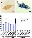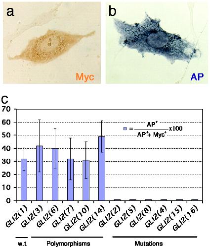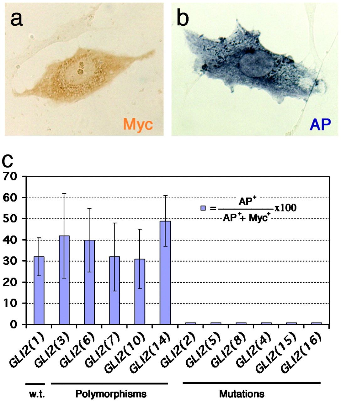 Fig. 4. Osteogenic lineage induction by GLI2 alleles in C3H10T1/2 cells. (a) WT and mutant alleles were transfected into cells, and the encoded proteins were detected by using an antibody against the N-terminal myc tag. (b) AP activity is detected when C3H10T1/2 differentiates into an osteogenic lineage. (c) Plot of the mean ± SEM of ratios of AP-positive cells per total transfected cells in 10 independent fields of cells, with one representative experiment shown. The apparent polymorphisms behave similarly to the normal control. The mutant alleles (nos. 2, 5, 8, 4, 15 and 16) lose the ability to induce AP activity.