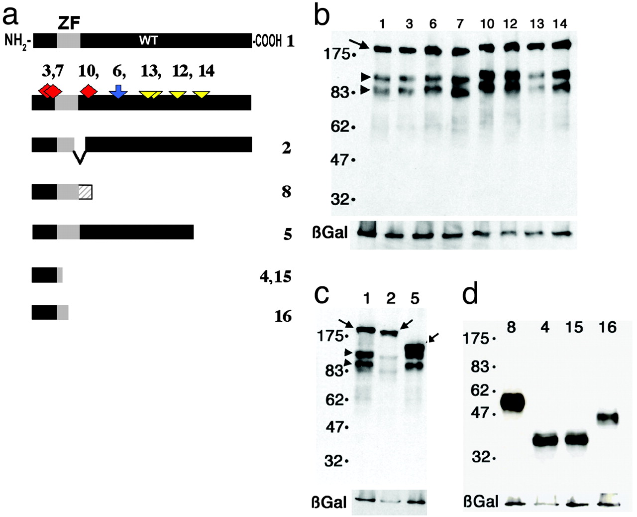 Fig. 1. Summary of the predicted structure of the missense and loss-of-function alleles in GLI2. (a) The WT architecture of GLI2 is depicted in the top bar (WT construct 1; ZF = Zn finger). Shown below are the apparently unique missense variants seen in human HPE patients (red diamonds), putative polymorphisms (blue arrow), and HUT102 sequence variants (yellow triangles). Three of these variations predict missense changes (red diamonds). These three changes [V104M, 310G>A (construct 3), D88N, 262G>A (construct 7), and N273S, 818 A>G (construct 10)] behaved identically with the normal gene and are likely rare polymorphisms (Fig. 3c and data not shown). Similarly, apparent polymorphisms (found in normal controls), such as K410R, 1229 A>G (blue arrow, construct 6), behaved identically to the WT cDNA (construct 1) in all assays performed, as did the putative HUT102 reference cDNA variants (yellow triangles, constructs 12-14). The predicted architecture of the disease-related variants is shown below. Construct 2 represents the predicted outcome of a hypothetical RNA splicing event removing exon 5. Confirmation of this form was not attempted, and the related construct 8 represents the more likely form. Failure to execute alternative splicing predicts premature termination within intron 5 (hatched bar; construct 8). Constructs 5 (2274del1), 4 and 15 (W113X, 339G>A), and 16 (R168X, 502C>T) represent the predicted protein structures that are prematurely truncated. Note that constructs 4 and 15 are identical truncation mutations except that construct 4 includes also the V104M missense mutation (as does construct 3). (b) Western analysis of COS-7 cells transfected with N-myc-tagged GLI2 alleles and probed with anti-myc antibody to verify expression. Untransfected cells show no bands (data not shown). Cotransfected lacZ mRNA encoded the β-galactosidase (β-Gal) control protein. The arrow marks the predicted full-length protein, and the arrowheads identify two consistently seen smaller proteins that could represent processed forms or stable degradation products. Although these smaller bands resemble those seen with frog Gli2 (6), their significance is unknown and will require further study. (c) The deletions caused by variants 2 and 5 produce the expected truncated proteins that are smaller than the WT full-length product encoded by construct 1. Note that the smaller processed bands are still formed in both, but in allele 2 they migrate faster, indicating that an apparently specific cleavage occurs between the zinc fingers and the site of truncation of construct 5. (d) The predicted truncations of the rest of the alleles cause smaller proteins of the expected sizes (constructs 4, 8, 15, and 16).