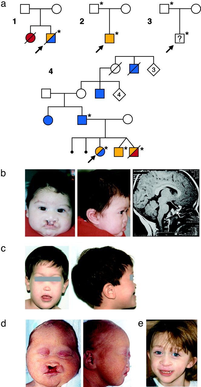 Fig. 2. Clinical findings in families with mutations in GLI2. (a) Pedigrees of four families (nos. 1-4) who have individuals with GLI2 loss-of-function mutations (*). Probands are indicated by an arrow, HPE is indicated by red symbols, hypopituitarism is indicated by orange symbols, and polydactyly is indicated by blue symbols. (b) Proband in family 1 with severe midfacial hypoplasia, bilateral cleft lip and palate, postaxial polydactyly, and pituitary hypoplasia (arrow). (c) Proband in family 2 with extreme midfacial hypoplasia, pseudomedian cleft lip, and severe growth retardation. (d) Deceased sibling in family 4 with midface hypoplasia bilateral cleft lip and palate, and absent pituitary and brain findings consistent with HPE (data not shown). (e) Proband in family 4 with midface hypoplasia, repaired cleft lip and palate, postaxial polydactyly, and absent pituitary on MRI (data not shown). The deceased male in the first generation of family 4 is reported to have had cleft lip and cleft palate in addition to polydactyly. These pedigrees are consistent with autosomal dominant transmission of a null GLI2 disease susceptibility gene.