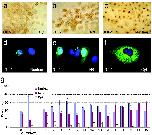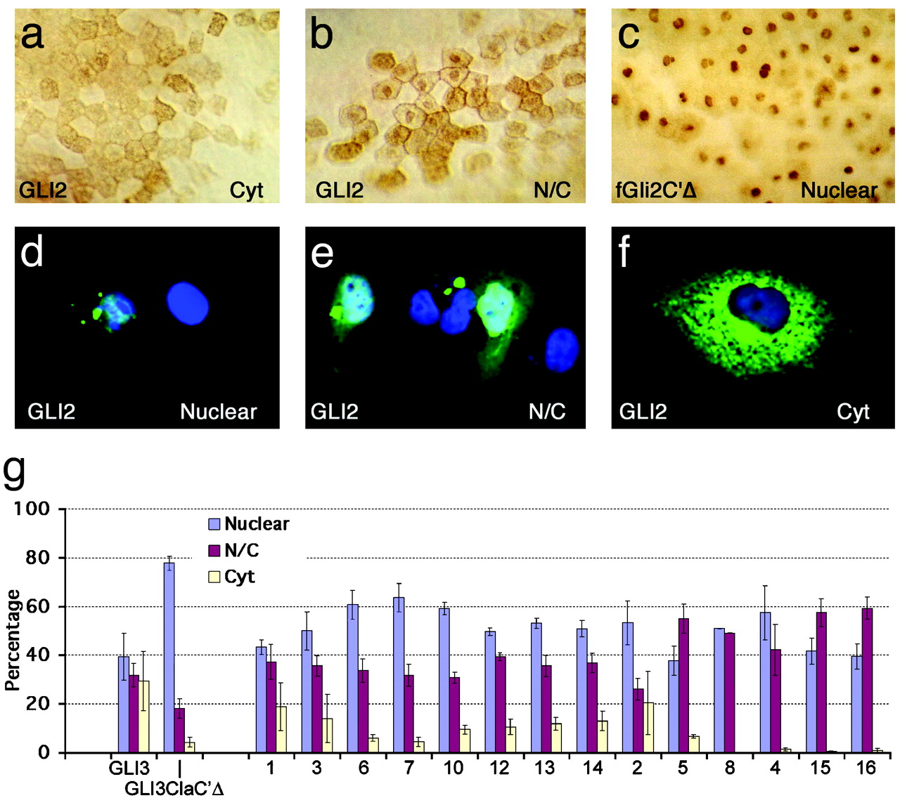 Fig. 5. Subcellular localization of GLI2 protein in animal cap cells of injected gastrula (stage 11) frog embryos. The normal and variant proteins were detected by using an antibody against the N-terminal myc tag. Representative examples of blastomere staining patterns are shown and quantified. Background levels were essentially none. (a) Prominent cytoplasmic staining, compared with combined nuclear and cytoplasmic staining (b). As a control for primarily nuclear staining (c) we used a frog Gli2 construct deleted for its C terminus (fGli2Câ²Î´) and previously shown to exhibit nuclear accumulation (6). A similar subcellular localization in transfected COS-7 cells was scored as primarily nuclear (d), both nuclear and cytoplasmic (e), or exclusively cytoplasmic (f). (g) Histograms showing the distribution of the different alleles in transfected COS-7 cells. Each allele was transfected three or four times, and >100 cells were counted in each experiment.