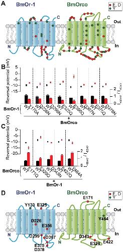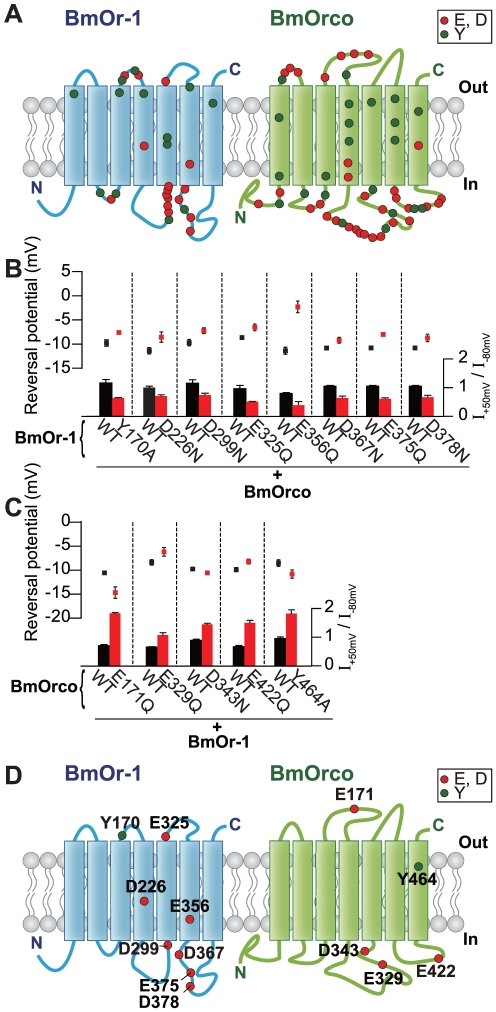 Figure 1. Mutations in BmOr-1 and BmOrco that affected reversal potential and rectification index.(A) Schematic of the location of amino acids in BmOr-1 and BmOrco that were mutated in this study. Transmembrane domains were predicted using the PHDhtm algorithm [48]. (B,C) Reversal potential (top) and rectification index (bottom) of oocytes expressing mutant BmOr-1 with wild type (WT) BmOrco (B) or WT BmOr-1 with mutant BmOrco (C). Black and red bars and symbols represent WT and mutants, respectively. Only mutants with a significant effect on both reversal potential and rectification index are depicted (unpaired Student's t-test, mutant vs. WT p<0.05). Data on remaining mutants can be found in Figure S2B. Data are shown as mean ± S.E.M., n = 8–10. Bombykol was applied at the concentration of 1 µM to each oocyte. (D) Schematic showing the eight mutations in BmOr-1 and five mutations in BmOrco that affected both rectification index and reversal potential (see also Figure S2B,S3A).