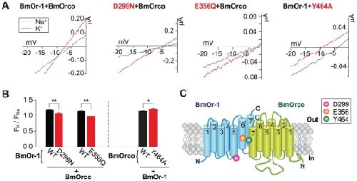 Figure 2. Mutations in BmOr-1 and BmOrco that affected ion selectivity.(A) Representative current-voltage (I–V) curves of oocytes expressing WT or mutant Or or BmOrco. Red and blue traces represent I–V curves obtained with Na+ and K+ solutions, respectively. (B) Summary of ion permeability ratios of the two BmOr-1 mutants (left) and the BmOrco mutants (right) that had a significant effect on ion selectivity (unpaired Student's t-test, mutant vs. WT **p<0.01; *p<0.05). Data on remaining mutants can be found in Figure S2C. Each bar represents mean ± S.E.M., n = 5–8. Bombykol was applied at the concentration of 1 µM to each oocyte. (C) Schematic showing the two mutations in BmOr-1 and one mutation in BmOrco that affected ion selectivity (see also Figure S2C,S3B).