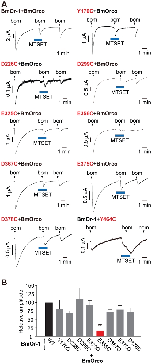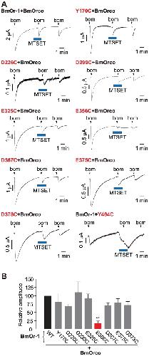 Figure 3. Effect of MTSET on ionic permeability of WT and Cys mutant BmOr-1-BmOrco complexes.(A) Representative current traces of oocytes expressing WT or mutant BmOr-1 or BmOrco. Bombykol (1 µM) and MTSET (2.5 mM) were applied at the time indicated by arrowheads and blue squares, respectively. (B) Summary of effects of MTSET on the bombykol response of WT (black bar) and mutant BmOr-1 (gray bars). The mutant with a significant effect on ion permeability is colored in red (unpaired Student's t-test, mutant vs. WT **p<0.01). Data are shown as mean ± S.E.M., n = 5 (see also Figure S4).