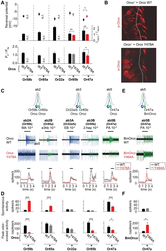 Figure 4. Effect of the Drosophila Orco Y478A mutation on Or-Orco function in heterologous cells and in Drosophila olfactory neurons.(A) Reversal potential (top), rectification index (middle), and permeability ratio (bottom) of oocytes expressing WT Drosophila Orco (black bars and symbols) or Drosophila Orco Y478A (red bars and symbols) along with WT ligand-selective Ors. Unpaired Student's t-test, mutant vs. WT, *p<0.05, **p<0.01. n.r. = no response. Data are shown as mean ± S.E.M., n = 8–10. (B) Anti-Orco antibody staining of WT Drosophila Orco (left) and Drosophila Orco Y478A expressed in Orco−/− animals. (C) (Top) Schematic of antennal sensilla showing the sensilla type and associated ligand-selective Ors. (Middle) Representative single-sensillum traces of ab2A, ab2B, ab3A, ab3B, ab5B neurons expressing WT Drosophila Orco or Drosophila Orco Y478A to methyl acetate, ethyl-3-hydroxybutyrate, ethyl butyrate, 2-heptanone, and pentyl acetate, respectively. Blue traces represent ab2A and ab3A neuron; green traces represent ab2B, ab3B, and ab5A and B neurons. (Bottom) Peristimulus time histograms of recordings from WT (black) and mutant (red). Data are presented as mean ±S.E.M., n = 3–7, and raw spikes/sec are plotted. (D) Summary of effects of WT Drosophila Orco (black bars) and Drosophila Orco Y478A (red bars) on spontaneous activity (top; raw spikes/sec) and odor-evoked activity. (bottom; corrected to subtract spontaneous activity). Unpaired Student's t-test, mutant vs. WT, *p<0.05, **p<0.01, ***p<0.001. Data are shown as mean ±S.E.M., n = 3–7. (E) (Top) Schematic of ab5 sensilla expressing WT BmOrco or BmOrco Y464A. (Middle) Representative single-sensillum traces of ab5 neurons expressing WT BmOrco or BmOrco Y464A to pentyl acetate. Green traces represent ab5A and ab5B neurons. (Bottom) Peristimulus time histograms of recordings from WT (black) and mutant (red). Data are presented as mean ±S.E.M., n = 4–5, and raw spikes/sec are plotted. (F) Summary of effects of WT BmOrco (black bars) and BmOrco Y464A (red bars) on spontaneous activity (top; raw spikes/sec) and odor-evoked activity. (bottom; corrected to subtract spontaneous activity). Data are shown as mean ± S.E.M., n = 4–5. Unpaired Student's t-test, mutant vs. WT, *p<0.05, **p<0.01, ***p<0.001.