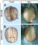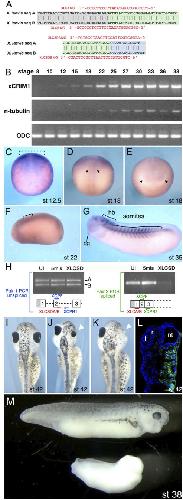 Figure 1. CRIM1 is expressed in the neural plate and is required for development of neural structures. (A) Antisense morpholino oligo (MO) sequences and their complimentary targets on the Xenopus laevis messenger sequences are indicated for both the translation blocking MOs (upper) and the splice-donor blocking MOs (lower). (B) RT-PCR assessment of CRIM1A transcript expression in developmentally staged Xenopus laevis embryos. n-tubulin is a neuronal differentiation marker and ornithine decarboxylase (ODC) a ubiquitously expressed control. (C) In situ hybridizations for CRIM1A in Xenopus laevis embryos. The dashed bracket in (C) indicates the neural plate region, the arrowheads in (D) the neural tube and in (E) the optic vesicles. cg: cement gland; hb: hindbrain. (H) Detection of unspliced or spliced CRIM1A and B mRNA in uninjected embryos (UI) or those injected with the 5-missense control (5mis) or splice blocking (XLCSD) MOs. The PCR primer pair XCPF and XCPR1 detects unspliced mRNA while XCPF and XCPR2 detect the spliced product. (I) CRIM1 loss-of-function experiments where (I) is an uninjected control and (J) were injected with XLCA and B MOs at 15 ng each. Small (J, arrowhead) or missing eyes (K, arrowhead) often result. The embryo in (L) was coinjected with 10 kDa Alexa-fluor 488 dextran (green). l: lens; r: retina; nt: neural tube. (M) Comparison of control embryo (upper) and embryo injected at the 2-cell stage bi-laterally with XLCAB at 30 ng each (lower). Develop- mental stages as indicated.