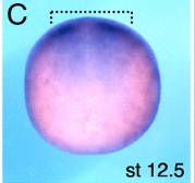 crim1 (cysteine rich transmembrane BMP regulator 1 (chordin-like)) gene expression in Xenopus laevis embryo, assayed via in situ hybridization, NF stage 12.5, dorsal view, anterior up.
