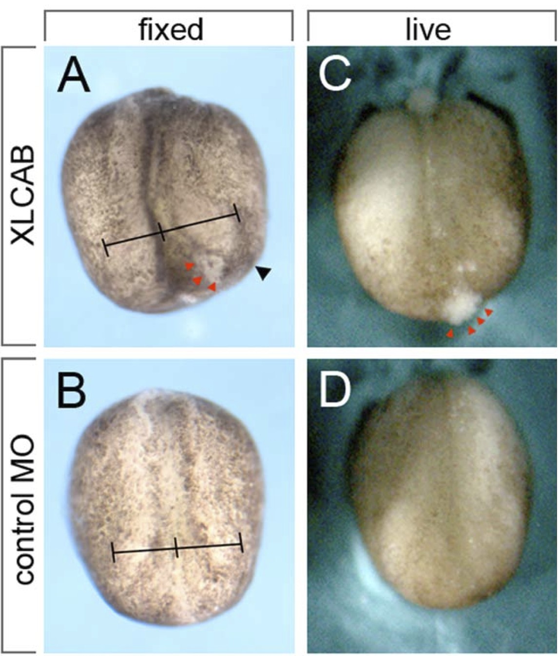 Figure 2. Disruption of neural fold morphogenesis in CRIM1 MO injected embryos. Pigmented embryos showed neural tube morphogenesis defects resulting from CRIM1 MO injection. In (A and B) line intervals mark the distance from the midline to the neural folds to emphasize the defect in morphogenesis that is a result of CRIM1 MO injection. In (A and C) red arrowheads indicate a region of cells that is sloughing from the embryo surface. doi:10.1371/journal.pone.0032635.g002
