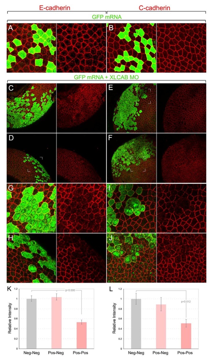 Figure 3. CRIM1 is required for junctional localization of E- and C-cadherin in the neural plate. (A) Immunofluorescence labeling of whole-mount Xenopus embryos after injection of translation-blocking XLCAB MOs. Embryos were co-injected with mRNA encoding GFP at the 4-cell stage and were fixed and labeled at stage 13 (early neurula) with antibodies to GFP (green), E-cadherin (A, C, D, G, H, red) or C-cadherin (B, E, F, I, J, red). Cadherin junctional complexes were visualized by combining multiple optical sections generated by confocal microscopy. In lower magnification images (C, D, E, F) it is apparent that tracer positive regions have lower levels of cadherin immunoreactivity and are irregularly shaped. In the magnified regions (G, H, I, J) indicated by white corner marks in (C, D, E, F) the loss of cadherin immunoreactivity in tracer positive cells is more obvious. The gray line between panels indicates separated color channels of the same image. (K) Graphs show the measured average E-cadherin (K) and C-cadherin (L) junctional staining intensity between two tracer-negative, one tracer negative and one tracer positive, or two tracer-positive cells (n = 20 pairs for each categories).
