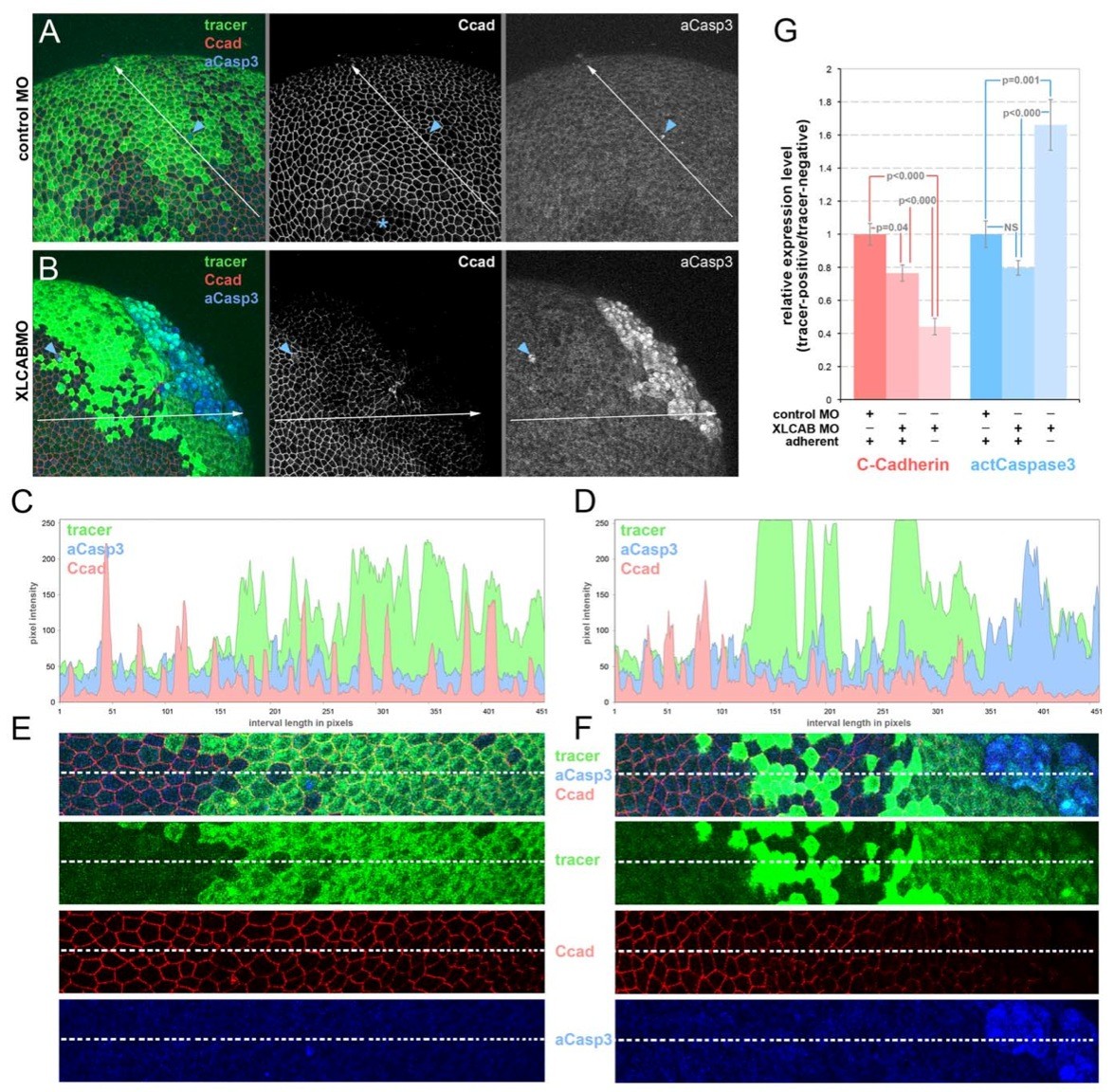Figure 4. Cadherin junctional complex deficiency is the primary response to CRIM1 loss-of-function. (A) Embryos were injected with either standard control MO or 15 ng each XLCAB MOs with dextran tracer (green), fixed at stage 13 and labeled for C-cadherin (Ccad) and activated caspase 3 (aCasp3). In (A) the asterisk indicates a region where labeling in the apical junctional complex was not imaged due to the optical sectioning plane. In (A and B), the blue arrowheads indicate isolated dying cells labeled positive for activated caspase 3. (C) Three-channel histograms indicating pixel intensity along a line interval of 450 pixels in control MO (A and C) and XLCAB MO (B and D) injected embryos. (E) Magnified images of regions along the line interval in (A and B) with color channel merge (top) and separated color channels corresponding to different labels as indicated. (G) Quantification of relative expression levels of C-cadherin and activated Caspase 3 in standard control MO and XLCAB injected embryos. The expression levels are determined by the ratio of average pixel intensities over 150-pixel intervals in tracer-positive regions and tracer- negative regions within the same embryo. In XLCAB injected embryos, relative expression levels were measured over intervals placed exclusively in tracer-positive, adherent regions or tracer positive, non-adherent regions (n = 8 for all categories).