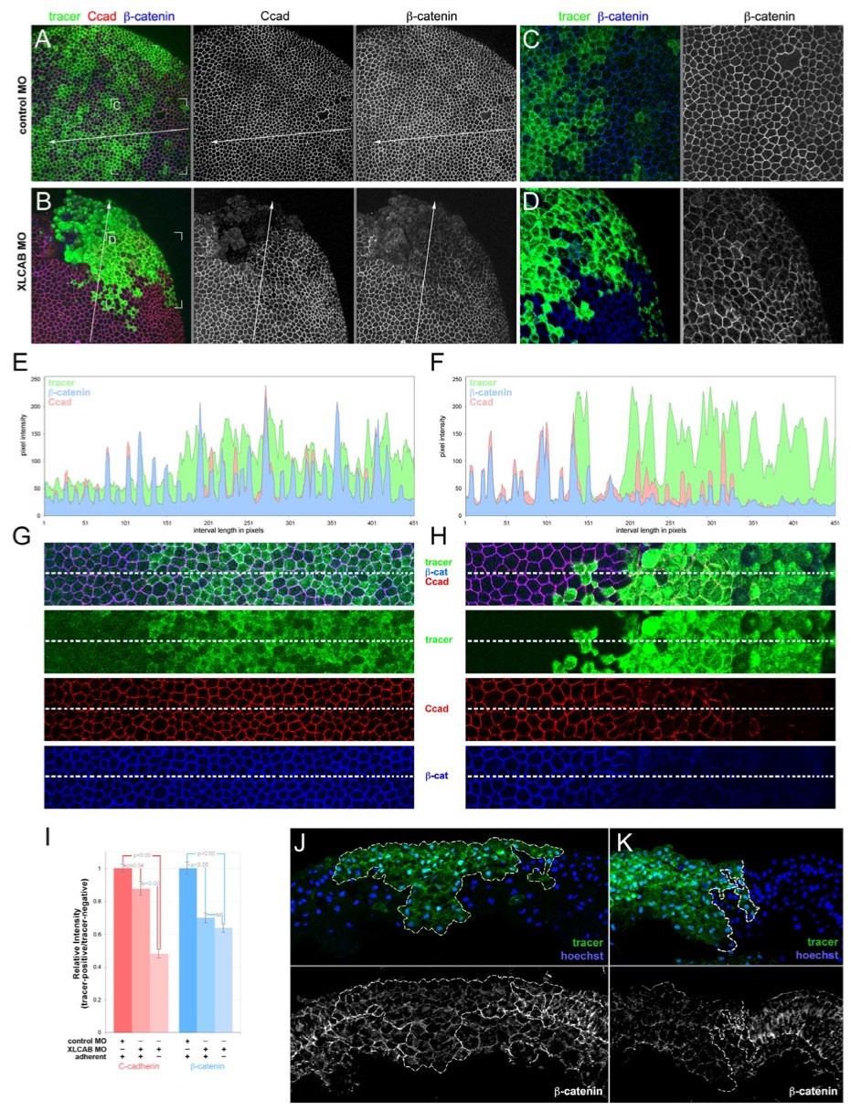 Figure 5. CRIM1 is required for junctional localization of catenin in the neural plate. (A) Whole-mount immunofluorescence labeling of stage 13 Xenopus embryos in which standard control MO (A, C) or translation-blocking XLCAB MOs (B, D) were co-injected with dextran tracer at the 4-cell stage. Embryos were labeled with antibodies to C-cadherin and catenin as indicated. (C) Higher magnifications of the indicated regions of (A and B). (E) Pixel intensity histograms of imuunofluorescence labeling for the line intervals shown in (A and B) respectively. (G) Magnified regions corresponding to the line intervals shown in (A and B) with color channel merge (top) and separated color channels corresponding to different labels as indicated. (I) Quantification of relative expression levels of C-cadherin and catenin in standard control MO and XLCAB injected embryos by normalizing average pixel intensities over 150-pixel line intervals in tracer-positive regions to those of tracer-negative regions within the same embryo. In XLCAB injected embryos, relative expression levels were measured over intervals placed exclusively in tracer-positive, adherent regions or tracer positive, non-adherent regions (n = 20 in all categories) (J) Immunofluorescence labeling of cryosections from Xenopus embryos at stage 16 (mid-neurula) of mildly affected embryos. MOs were co-injected with dextran tracer (green). Cryosections were labeled with Hoechst 33258 for nuclei (blue) and with antibodies to catenin (J, K, white). Tracer-positive regions are outlined with a dashed white line. The gray line between panels indicates separated color channels of the same image.