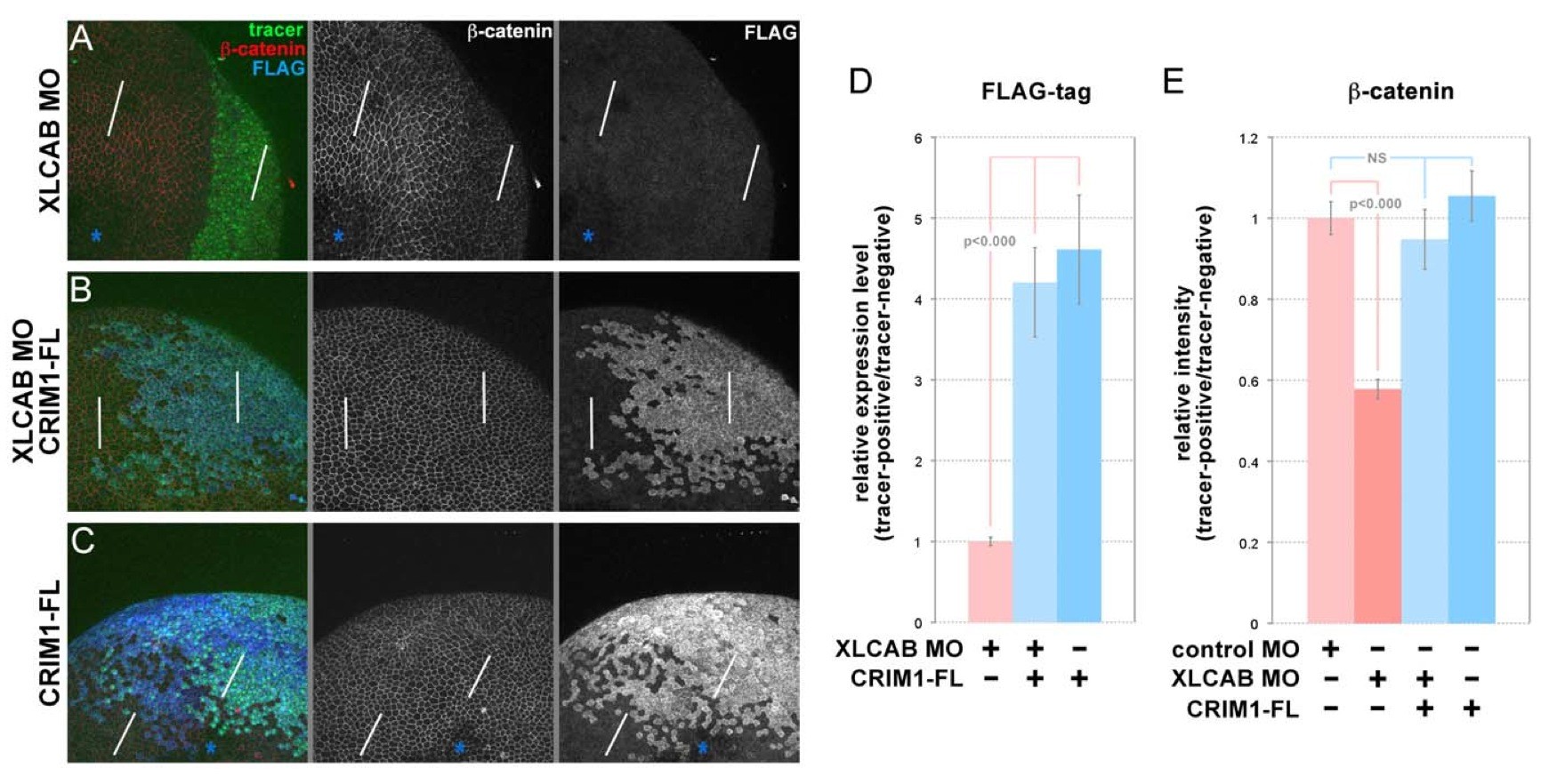 Figure 6. Restoration of CRIM1 expression can rescue catenin level in CRIM1 loss-of-function embryos. (A) Whole-mount immunofluorescence labeling of stage 13 Xenopus embryos in which XLCAB MOs, MO-resistant mRNA of FLAG-tagged full-length CRIM1 (CRIM1-FL) or a combination of the two were injected at the 4-cell stage, together with dextran tracer. In (A and C) the asterisks indicate regions where labeling in the apical junctional complex were not imaged due to the optical sectioning plane. (D) Quantification of relative expression level of FLAG-tagged CRIM1 protein by calculating the ratio of average pixel intensity of FLAG labeling over 150 pixel line intervals placed in tracer-positive or tracer- negative regions (white bars in A). (E) Quantification of relative expression level of catenin by calculating the ratio of average pixel intensity of catenin labeling over 150 pixel line intervals placed in tracer-positive or tracer-negative regions (white bars in A). doi:10.1371/journal.pone.0032635.g006