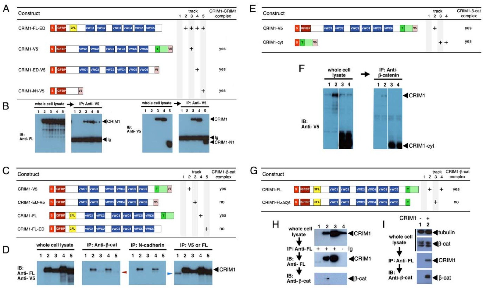 Figure 7. CRIM1 self-associates via the N-terminal domain and forms a complex with catenin and N-cadherin via the C-terminal domain. (A, C, E, G) Tables showing CRIM1 expression constructs used in pull-down assays and result summaries. (B) According to anti-V5 immunoprecipitations from the same whole-cell lysates, CRIM1-V5 (track 3), CRIM1-ED-V5 (track 4) and CRIM1-N1-V5 (track 5) all interact with CRIM1- FL-ED suggesting multimerization via the N-terminal region represented in CRIM1-N1-V5. The immunoglobulin used for immunoprecipitation is detected in the immunoblot of (B), right panels of each pair (Ig). (D) Anti-V5 and anti-FLAG (FL) immunoblots of whole-cell lysates show all CRIM constructs shown in (C) express to abundant levels in 293 cells. Control anti-V5, anti-FLAG immunoprecipitation followed by anti-V5, anti-FLAG immunoblot shows that CRIM1 proteins are readily detected. Immunoblots of the same immunoprecipitations with anti-catenin or anti-N-cadherin antibodies show that CRIM1 forms complexes with catenin and N-cadherin but only if the CRIM1 cytoplasmic domain is present. The band in track 1 of D (blue arrowhead) is a background band. (F) Anti-V5 immunoblots of whole cell lysates (left panel) and anti-catenin immunoprecipitations (right panel) show a version of CRIM1 with the signal peptide, trans-membrane domain and cytoplasmic domain forms a complex with catenin. (H) immunoprecipitation using anti-FLAG antibodies in 293 cells expressing either CRIM1-FL or CRIM1-FLDcyt. catenin co-immunoprecipitates with CRIM1-FL, track 2, but not with CRIM1-FLDcyt, track 3. Track 4 shows a control IP from 293 cells expressing CRIM1-FL where no primary antibody was added. No catenin association is observed. (I) Co-immunoprecipitation of catenin with FLAG-tagged CRIM1-FL with 293 whole cell lysate shows detection of endogenous catenin. Anti-tubulin western blot was shown as loading control. In all experiments, an equal proportion of lysate is represented on compared gel tracks.