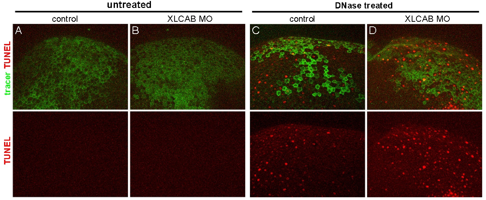 Figure S1. Cell apoptosis does not occur prior to loss of junctional cadherions in CRIM1 MO injected embryos. (A and B) TUNEL labeling of stage 13 control (A) or XLCAB injected (B) embryos with color channel merge on top and TUNEL channel alone at bottom. (C and D) TUNEL labeling of stage 13 control (C) or XLCAB injected (D) embryos treated with DNase I to manually nick genomic DNA. Color channel merges are on top and TUNEL alone shown at bottom.