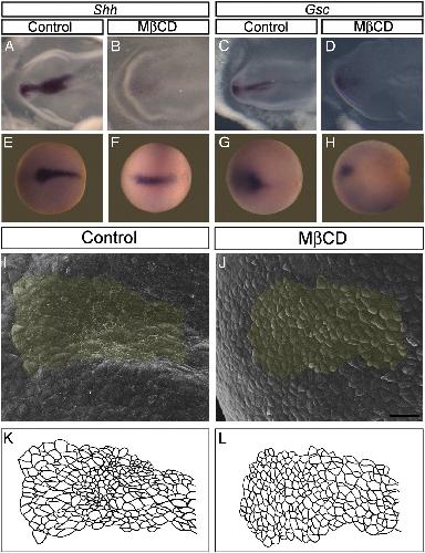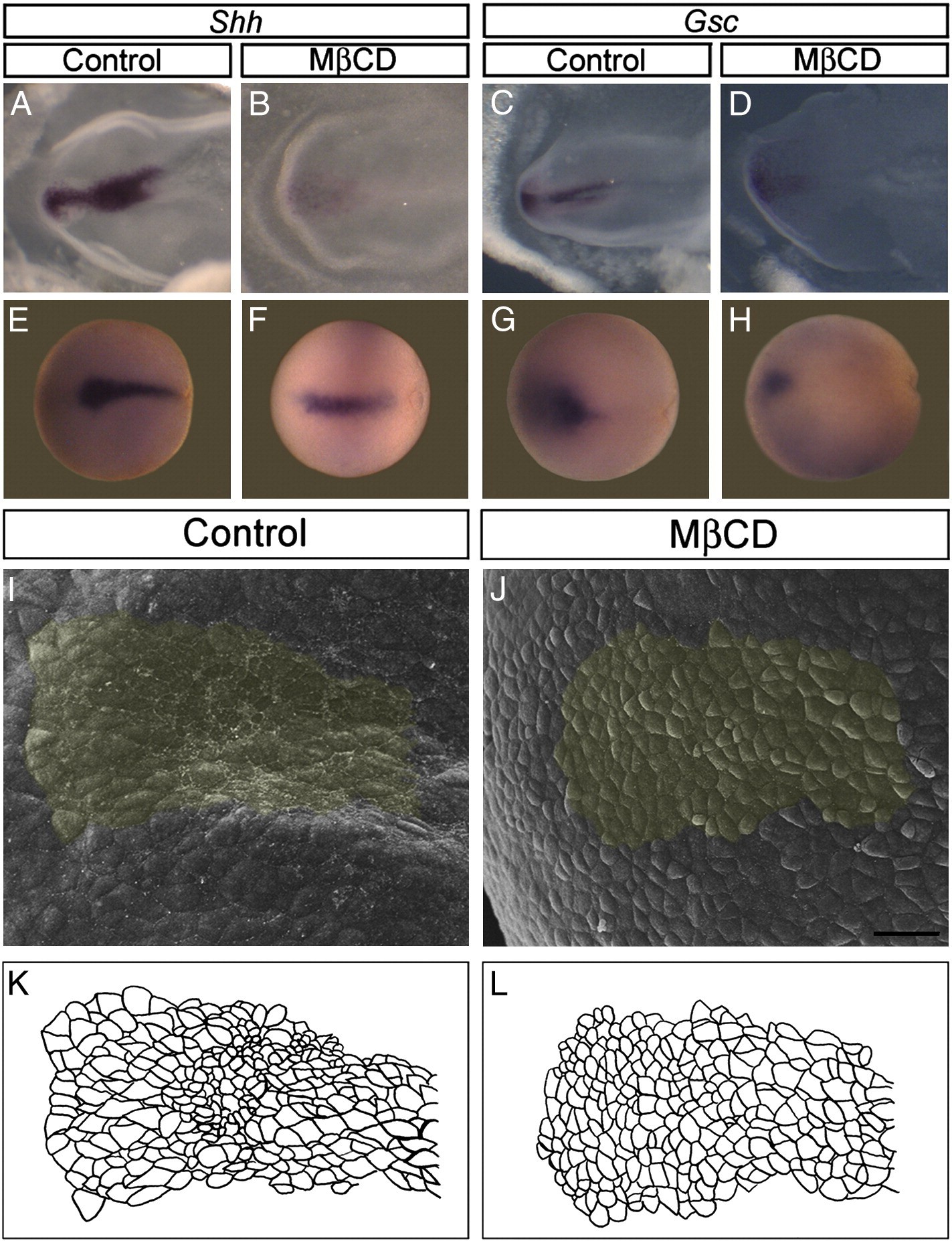 Fig. 6. The prechordal plate is defectively formed in MβCD-injected embryos. Chick embryo in situ hybridization for the PcP markers Shh (A and B) and Gsc (C and D) shows reduction of these PcP markers in MβCD-treated embryos. In Xenopus embryos, the anterior expression of Shh and Gsc is also reduced (E). Scanning Electron micrographs of the outer side of the neural plate of Xenopus embryos show polarized cells and a rosette-like arrangement in the control (I), while this morphology is lost by cholesterol depletion (J). Schematic drawing highlights the morphology of the anterior midline cells from control (K) and MβCD-injected embryos (L). Schematic drawing was artificially colored in photomicrographs I and J. Scale bar: 50 μm.