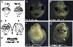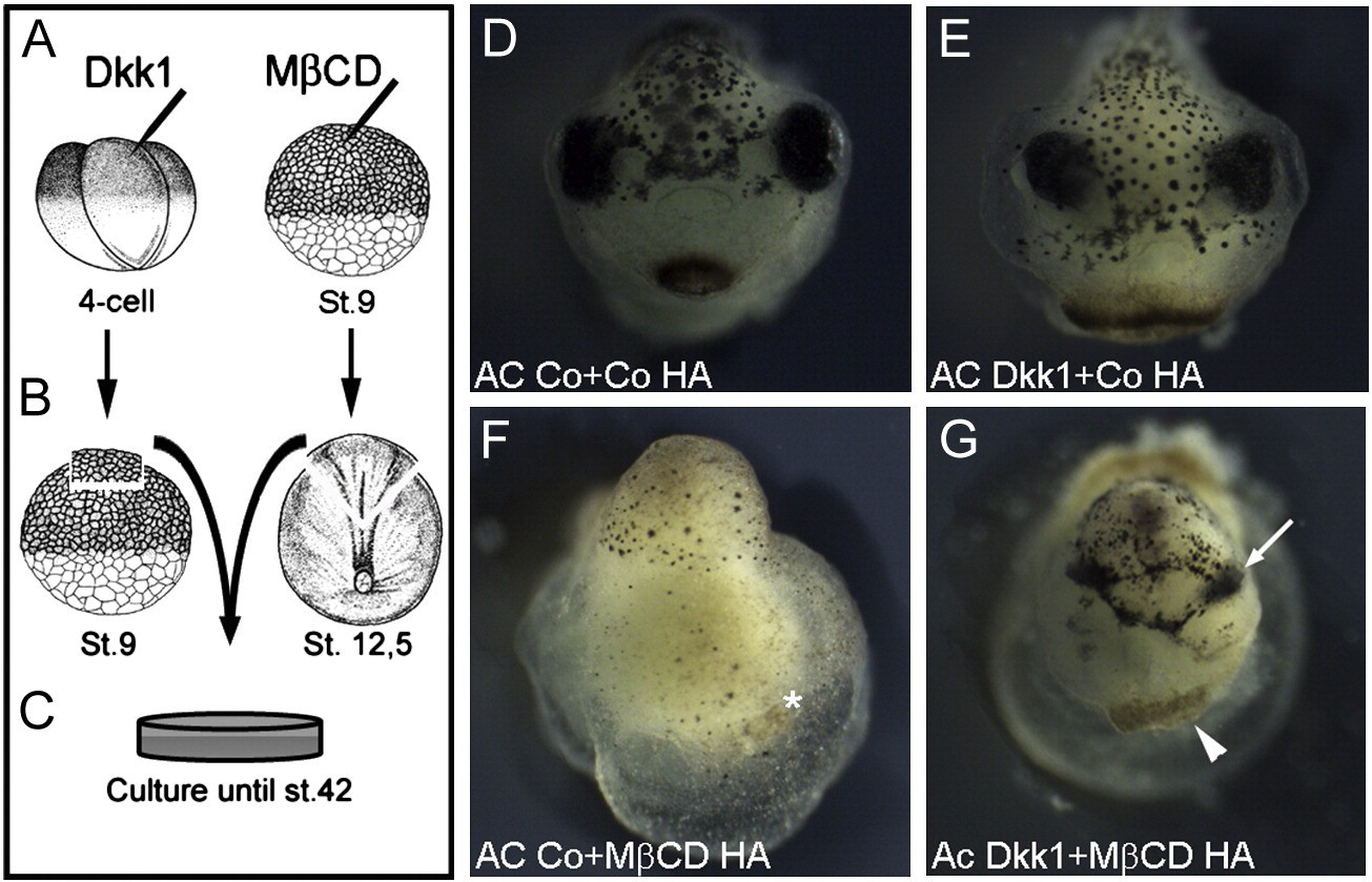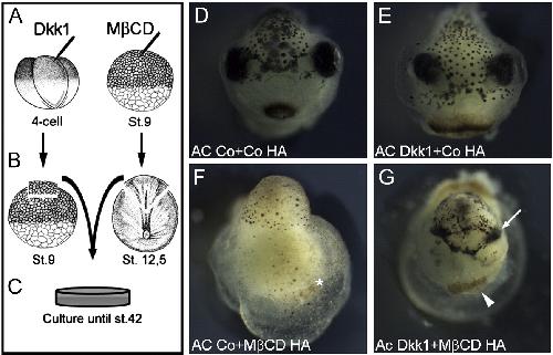 Fig. 7. Head anlage from MβCD-injected embryos is partially rescued by Dkk1. Schematic drawing showing animal caps (AC) of Dkk1 RNA injected embryos or control AC (A) were grafted to HA of control or MβCD-injected embryos (B). The explants were cultured until stage 42 (C). HA control with AC control generated normal heads (D). Dkk1 AC with control HA generated an anteriorized head (E). AC control with MβCD-HA generated a posteriorized head (F). Dkk1 AC with MβCD-HA generated head containing small symmetrical eyes (arrow) and cement gland (arrowhead, G).