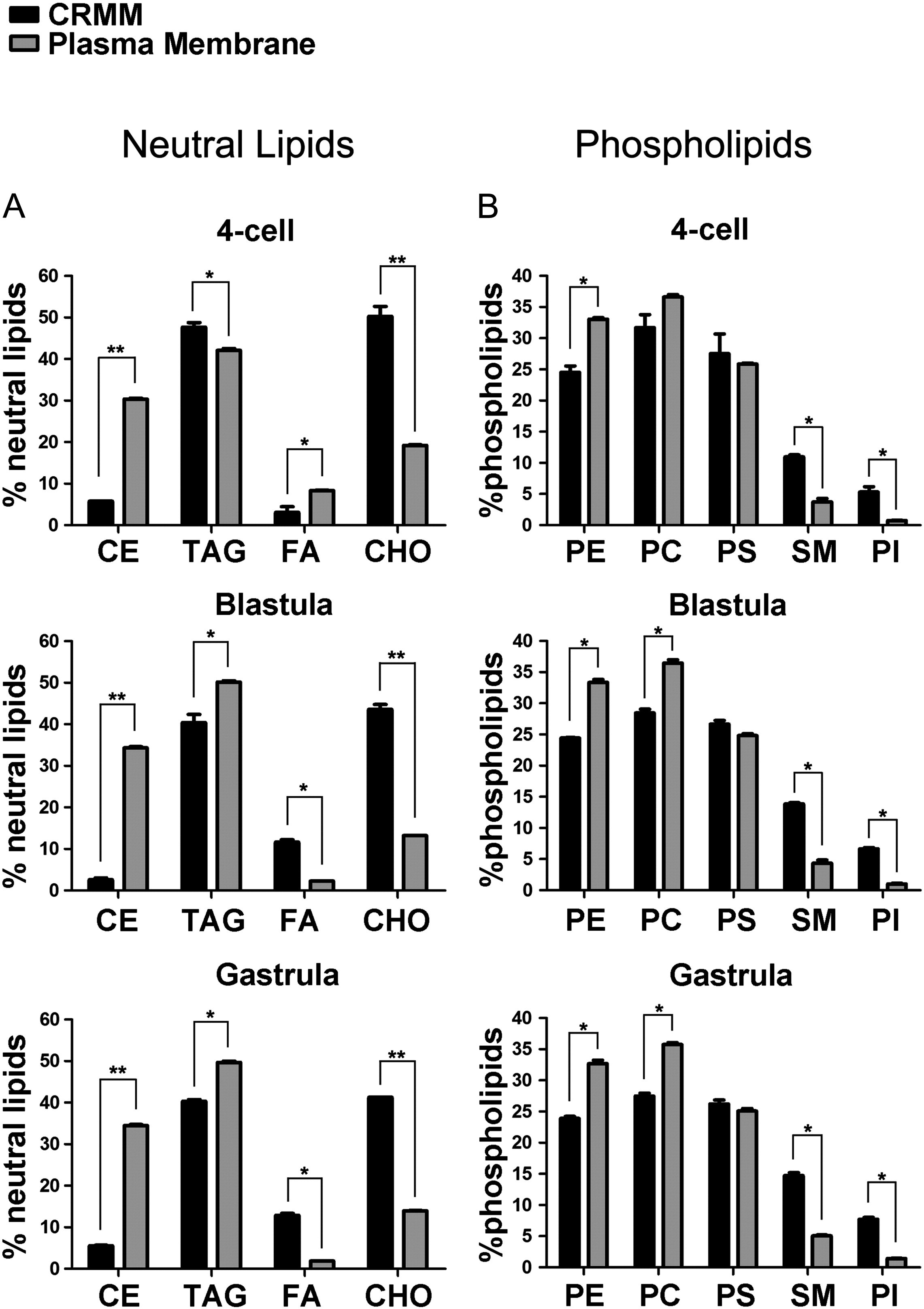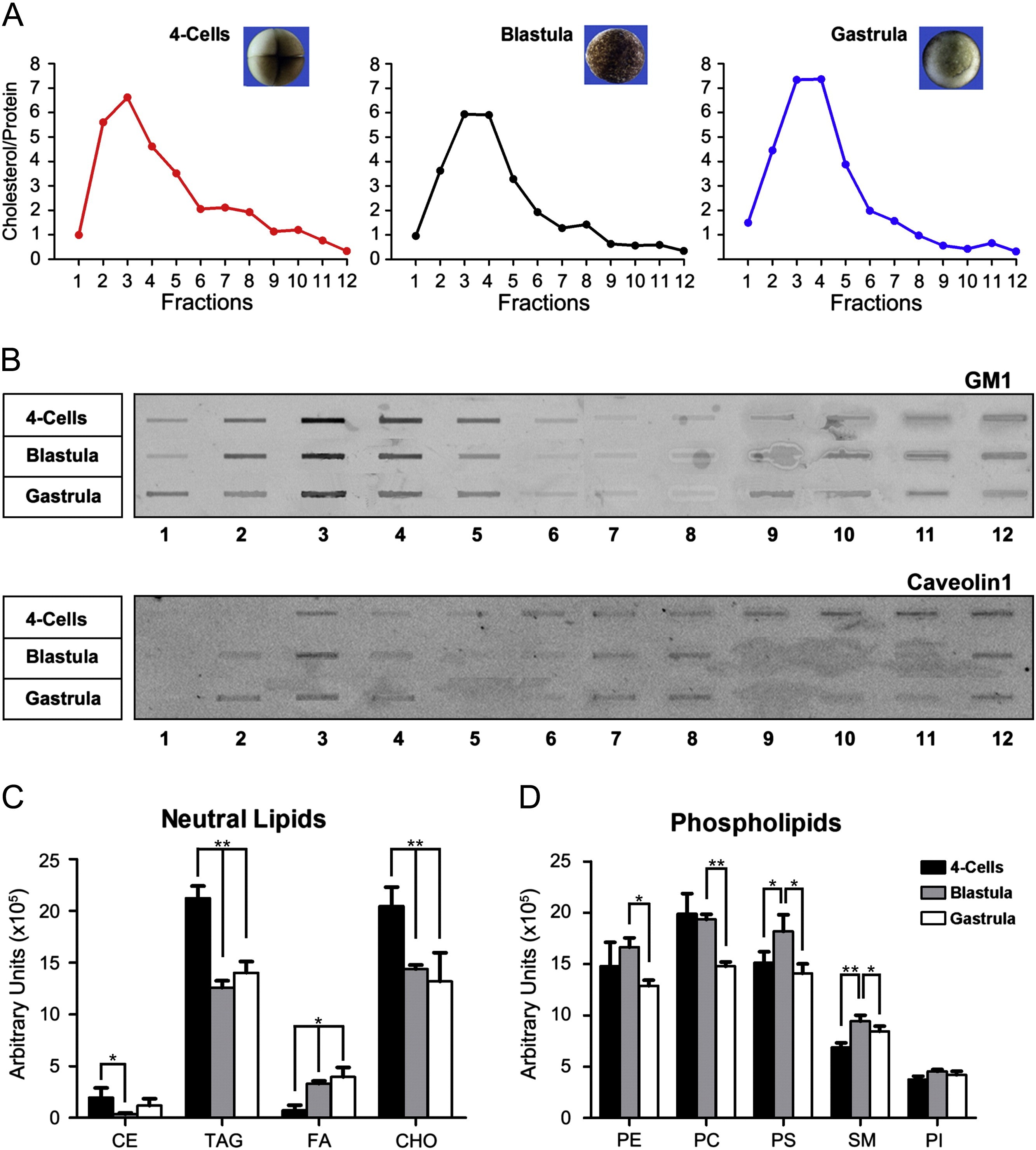Fig. 1. CRMMs are present and have a dynamic composition during development. (A) Cholesterol content assays of the fraction obtained by the sucrose gradient showed a peak in low-density fractions at the 4-cell, blastula and gastrula stages. (B) Dot blot analysis revealed the presence of GM1 ganglioside and Caveolin1 protein in the low fractions. (C) Lipid characterization showed cholesterol (CHO) and triacylglycerol (TAG) as the most abundant among the neutral lipids, while phosphatidylethanolamine (PE), phosphatidylcholine (PC) and phosphatidylserine (PS) were the predominant phospholipids in the CRMM fraction. (CE) cholesterol ester, (FA) fatty acid, (SM) sphingomyelin, (PI) phosphatidylinositol. (*P < 0.05; **P < 0.01).