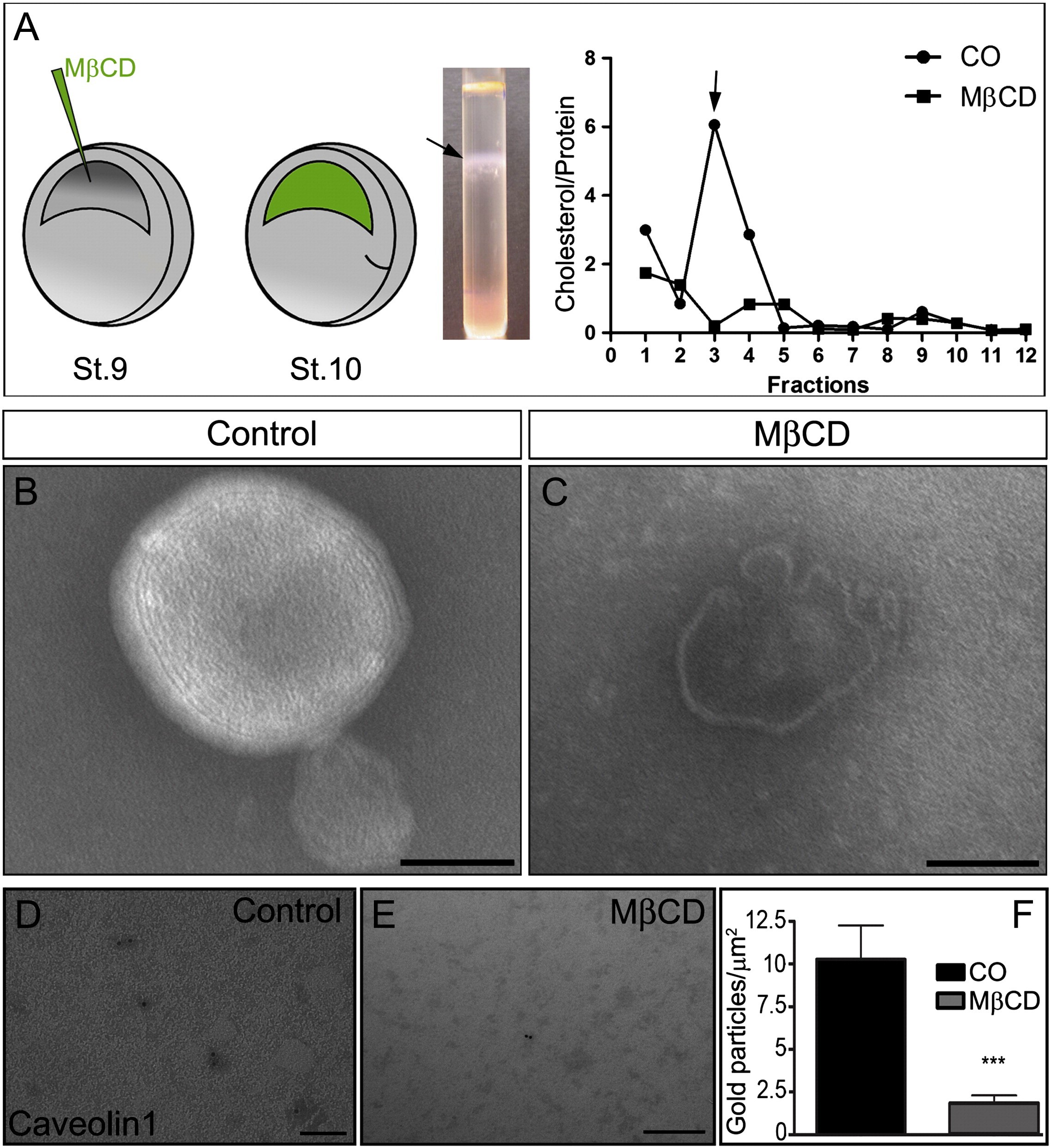 Fig. 2. MβCD disrupts Xenopus embryo CRMMs composition and morphology. (A) MβCD was injected into the blastocoel of stage 9 embryos and grown until stage 10. After centrifugation in sucrose gradient, CRMMs were observed as a turbid fraction in the light portion of the gradient (arrow). A peak of cholesterol content in light fractions characterizes the presence of CRMMs at the gastrula stage (arrow and circle lines). This peak is lost after MβCD injection, suggesting the disorganization of CRMMs (square lines represent the 40 mM MβCD cholesterol depletion). (B) The fraction with isolated CRMMs observed by negative staining, shows a multilamellar structure 73% (n = 15); while the fraction obtained from MβCD-treated embryos (C) shows a disorganized unilamellar vesicular structure 85% (n = 14). (D) Caveolin1 immunoassay of the CRMM fraction shows significantly decreased staining in the MβCD fraction compared to the control (CO) fraction. ***P < 0.001 by Mannhitney test. Scale bars: B, C, D: 0.1 μm; E: 0.2 μm.