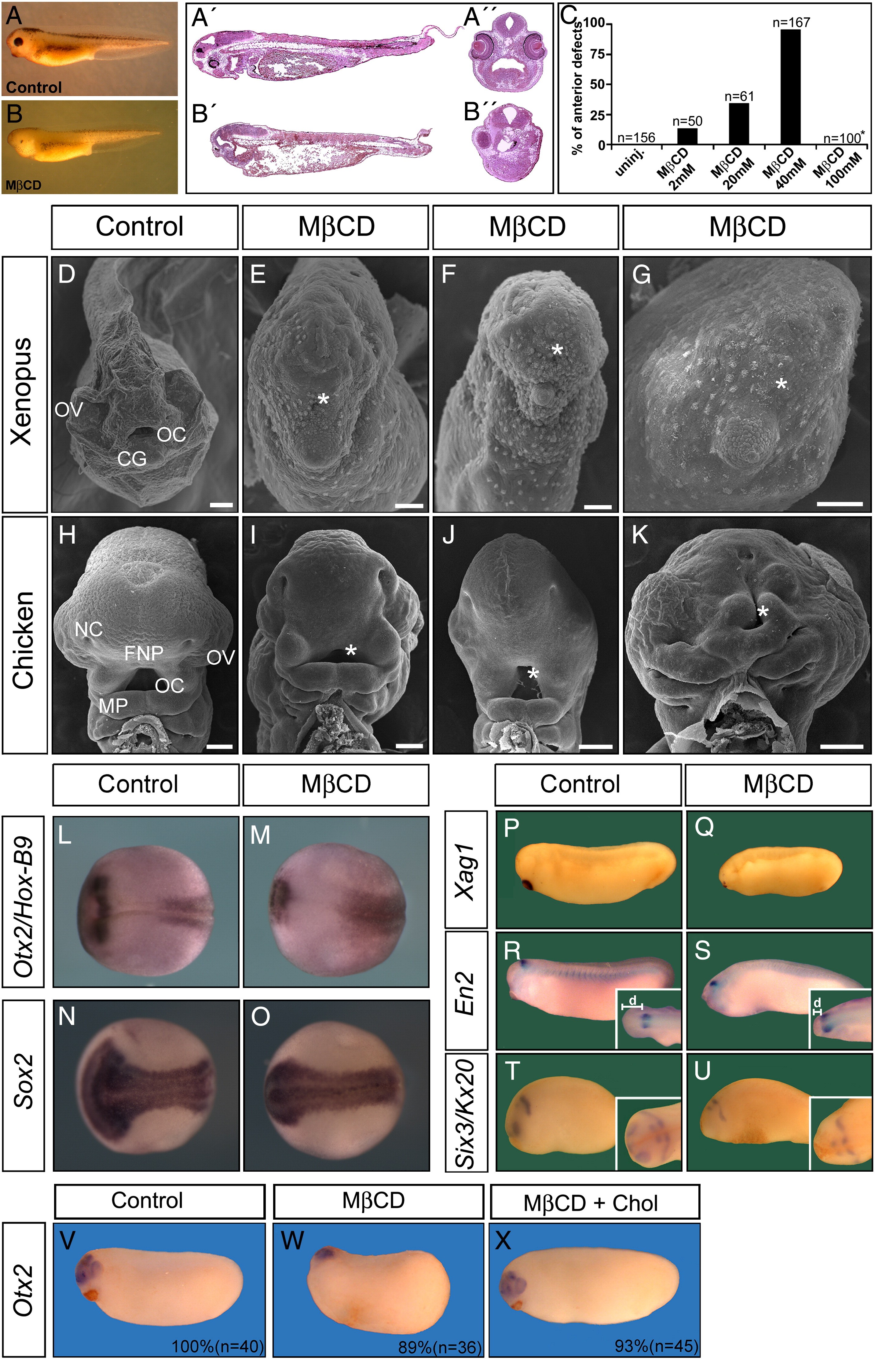 Fig. 4. Cholesterol depletion affects Xenopus and chick head development. Stage 9 embryos were injected with 2 mM, 20 mM, 40 mM and 100 mM of MβCD into the blastocoel and scored for anterior defects at stage 40. (A) Control embryos at stage 40 display normal morphology. (B) MβCD-injected sibling embryo presenting head defects such as microcephaly, absence of forebrain, cement gland small or absent, and eyes reduced or absent. Notice in longitudinal (A′ and B′) and coronal (A″ and B″) sections of stage 40, that in control embryos, the forebrain, ventricle, midbrain, hindbrain and eyes can be distinguished (A and A″), but in MβCD-injected embryos, the forebrain and eyes are dramatically affected (B and B″). The notochord is evident in both control and MβCD-injected embryos. (C) The graph shows the percentage of embryos displaying anterior defects in uninjected embryos and in embryos injected with different concentrations of MβCD. is the number of embryos scored. Asterisk represents dead embryos, which were not scored. Representative photomicrographs of Xenopus (D, stage 40) and chick (H, E3) untreated (control D, H) and MβCD-treated embryos (E, I). Control embryos developed complete face structures, while cholesterol-depleted embryos showed truncated or absent anterior structures. The phenotypes are scored by severity as: mild phenotype (E and I), intermediate phenotype (F and J), and severe phenotype (G and K). Mandibular process (MP). Optic vesicles (OV), frontonasal process (FNP), oral cavity (OC), cement gland (CG), nasal cavities (NC). Asterisk corresponds to OC in MβCD-treated embryos. Xenopus embryos in situ hybridization show the anterior marker Otx2 reduced after MβCD-induced cholesterol depletion, while the spinal cord marker, HoxB9, is not affected (L and M). The anterior domain of Sox2 expression is reduced in MβCD-injected embryos (N and O). The cement gland marker, Xag-1, is reduced in MβCD-injected embryos compared with the control (P); however, the expression of the isthmus marker En-2 remains unaffected in both the control and MβCD-injected embryos (R), but the distance (d) from En-2 expression domain to the most anterior region is shorter in MβCD-injected than in control embryos, evidencing forebrain reduction (insert R). Eye-field marker Six-3 was completely abolished in MβCD-injected embryos, but the rhombomere 3/5 marker Krox-20 was not affected in control and MβCD-injected embryos (T). MβCD was previously saturated with cholesterol (Chol) and then injected into the blastocoels. Whole mount in situ hybridization shows Otx-2 expression in control (V), reduced expression in MβCD-injected embryos (W), and normal expression in MβCD + cho-injected embryos (X). Scale bar: 100 μm (D) and 250 μm (H).