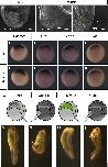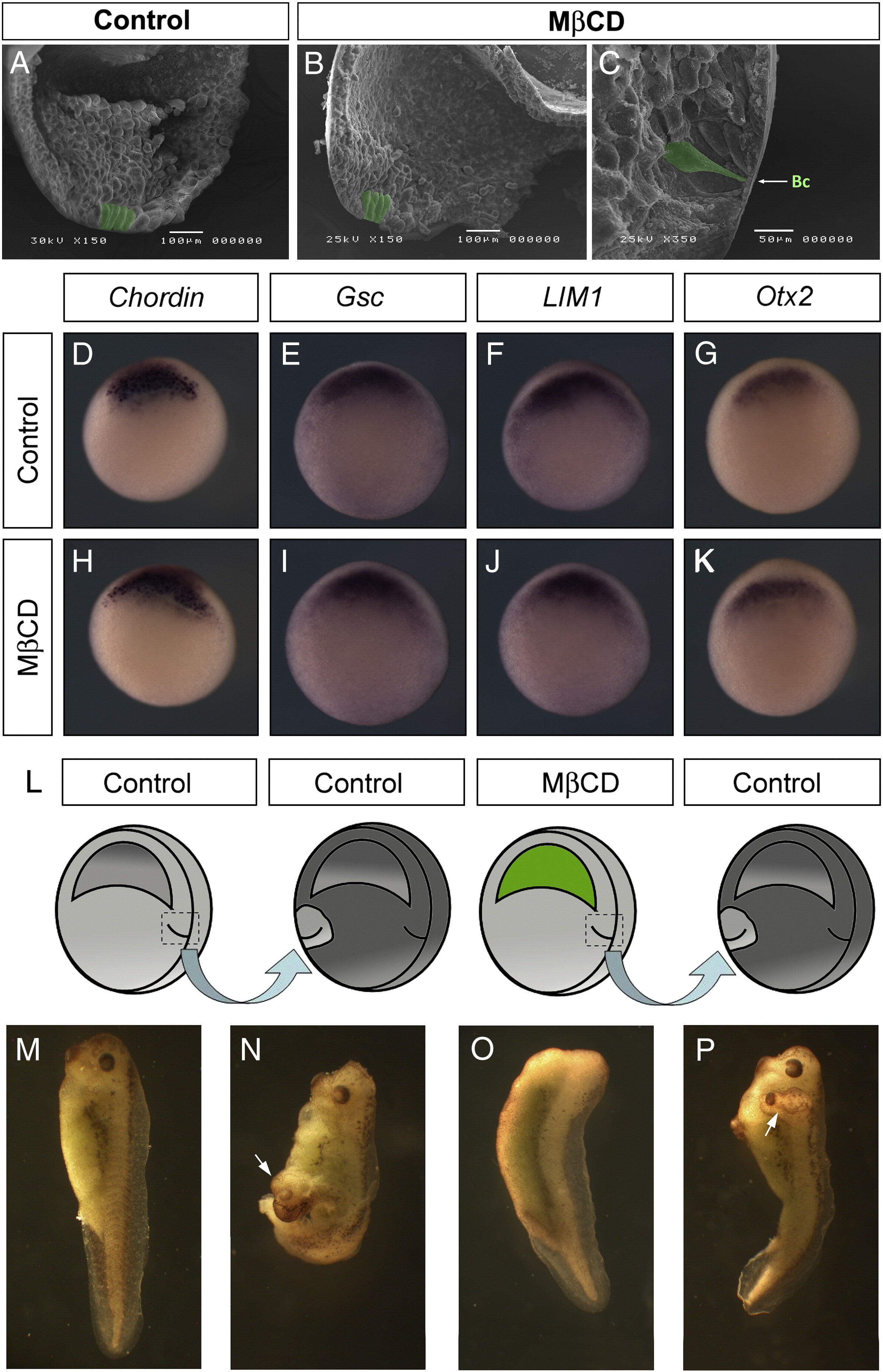 Fig. 5. Cholesterol depletion has no effect on the Spemann's organizer. Scanning electron microscopy shows the blastocoel roof and migrating post-mesodermal cells of the dorsal side. Bottle cells (Bc, light green) appear to be morphologically preserved in MCD-injected embryos (B) and control (A) embryos. In situ hybridization of chordin, goosecoid (Gsc), LIM1 and Otx2 in early gastrula Xenopus embryos (D). In both control (D) and MβCD-injected (H) embryos, the expression domains of these genes were not altered. Spemann's graft experiment where dorsal lips of uninjected and MβCD-injected gastrula embryos were grafted on the ventral side of uninjected gastrula embryos and developed until stage 35 (L). A control embryo develops normally (M). When the dorsal lip from a donor control embryo is grafted on the ventral side of a control embryo, a secondary axis containing the head is detected (N, arrow). MβCD-injected embryo showing loss of head structures (O). An MβCD-injected dorsal lip grafted on the ventral side of a control embryo is capable of inducing a secondary axis containing a head (P, arrow).