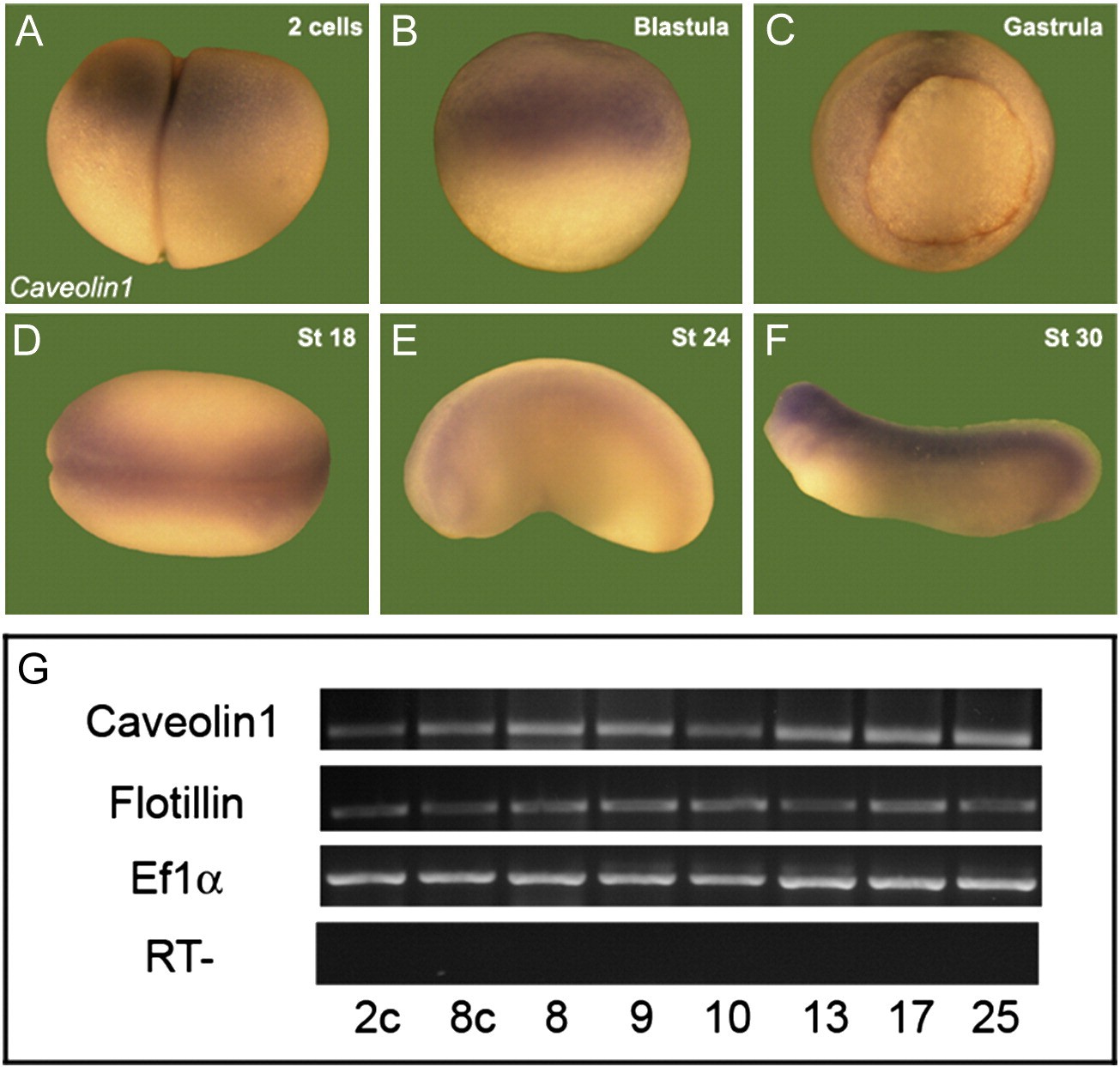 Fig. S1. Caveolin1 and Flotillin are detected very early in Xenopus development. Xenopus in situ hybridization for Caveolin1 shows expression from the 2-cell stage and the blastula in the animal pole (A, B). At the gastrula, neurula and tailbud stages, the transcripts are detected in the dorsal region of the embryo (C). RT-PCR shows the expression of Caveolin1 and Flotillin from the 2-cell to the tailbud stages (G), where the transcripts are detected in all stages. EF1α was used as a RNA loading control. In RT- the reverse transcriptase was omitted. Stages 2c, two-cells, 8c, eight cells and stages 8 to 25.