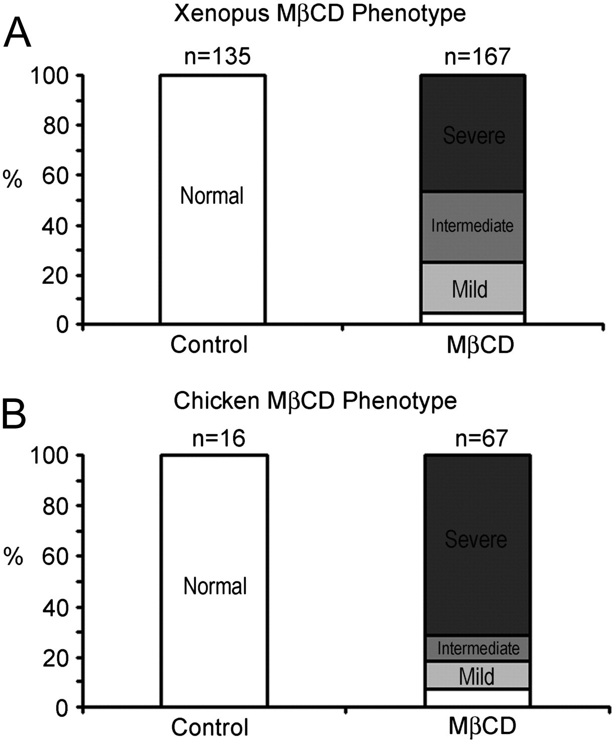 Fig. S3. Phenotype scoring of Xenopus (A) and chick (B) embryos in control and MβCD-treated embryos. In both Xenopus and chicks, the majority of the MβCD-treated embryos displayed the severe phenotype (50% in Xenopus embryos, n = 167, and 60% in chick embryos, n = 67). The intermediate phenotype comprised 25% in Xenopus and 10% in the chick, while the mild phenotype comprised 15% in Xenopus and 18% in the chick.